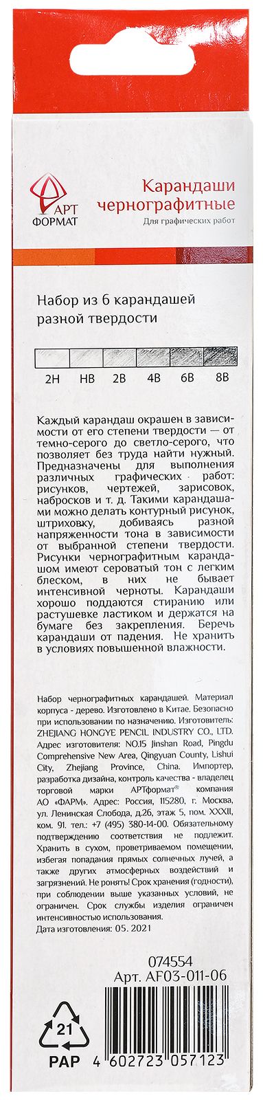 Количество в упаковке, шт: 6 Наличие европодвеса: Да Цвет корпуса: серый Заточенный: Да Форма корпуса: трехгранный Упаковка: картонная коробка Мин. партия и варианты упаковок: 1 / 24 / 480 Набор чернографитных карандашей деревянные АРТформат 6 шт 2Н-8В заточенные, трехгранные, картонная коробка с европодвесом
