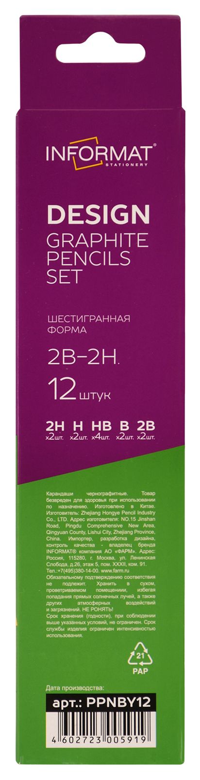 Количество в упаковке, шт: 12 Наличие европодвеса: Да Цвет корпуса: желтый Заточенный: Да Форма корпуса: шестигранный Упаковка: картонная коробка Мин. партия и варианты упаковок: 1 / 12 / 240 Набор чернографитных карандашей деревянные INFORMAT DESIGN 12 шт 2В-2Н заточенные, шестигранные, картонная коробка с европодвесом