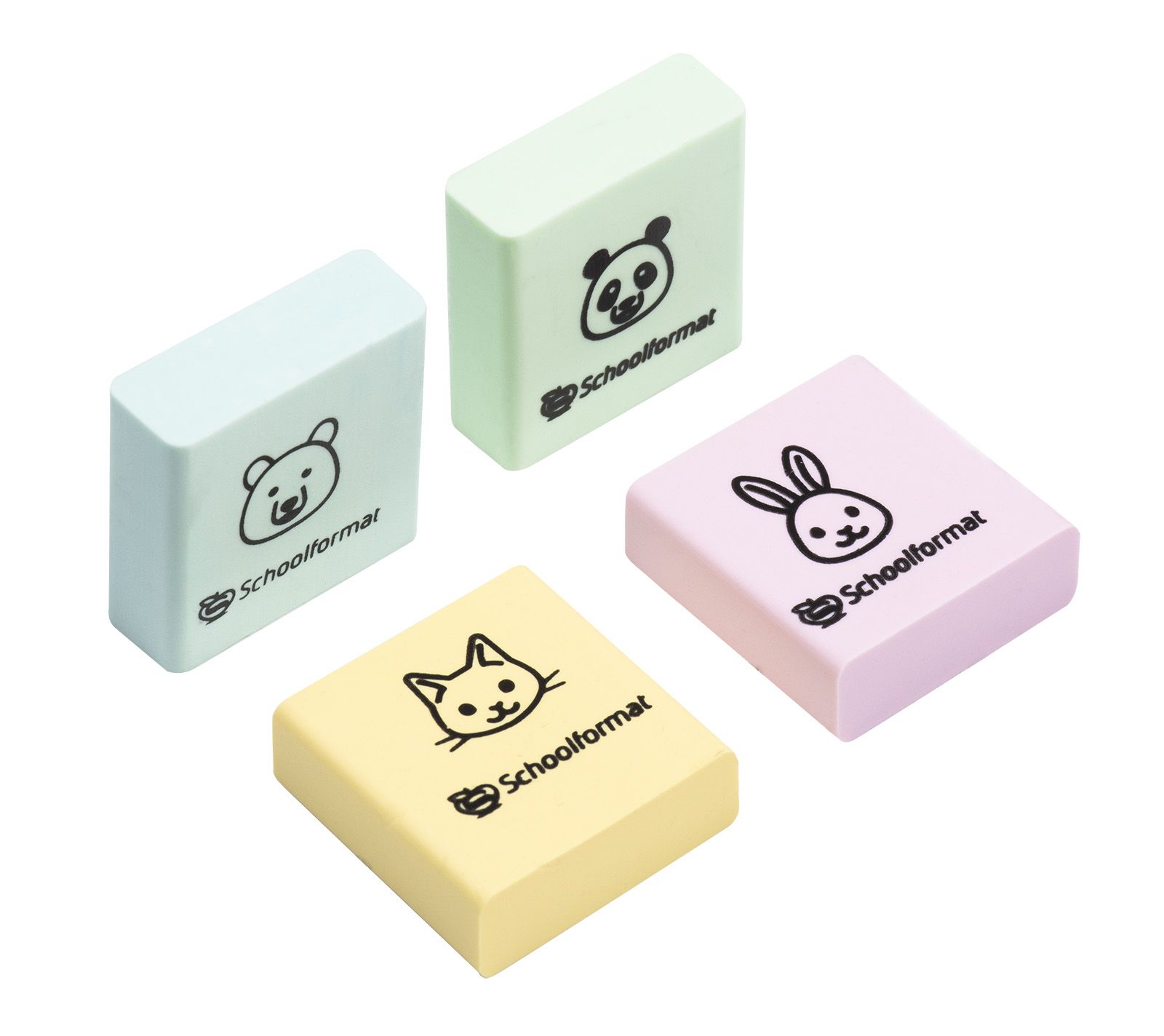 Цвет: ассорти Размер: 34х34х14 мм Наличие европодвеса: Да Упаковка: пакет Вид чертежных принадлежностей: Набор ластиков Материал: ПВХ Мин. партия и варианты упаковок: 1 / 12 / 144 Набор ластиков Schoolformat КОТИКИ, ПВХ, 34х34х14 мм прямоугольный, ассорти, мягкий, 4 шт в пакете