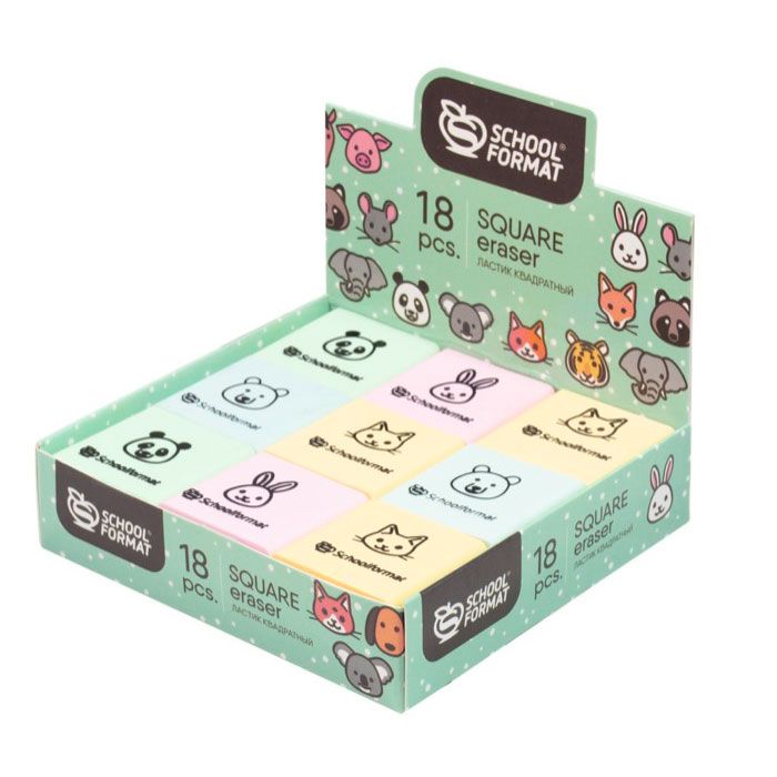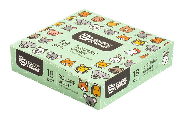 Цвет: ассорти Размер: 35х35х13 мм Наличие европодвеса: Нет Упаковка: дисплей Вид чертежных принадлежностей: Ластик Материал: резина Мин. партия и варианты упаковок: 1 / 18 / 720 Ластик Schoolformat ANIMALS 35х35х13 мм, квадратный, ассорти