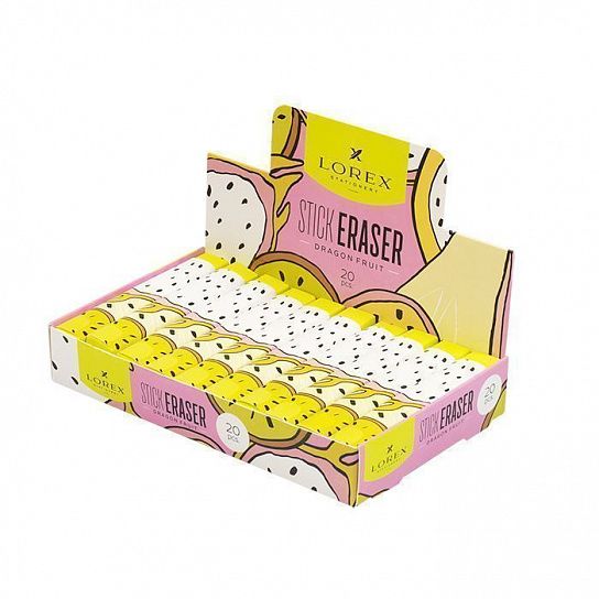 Цвет: желтый Размер: 85х12х10 мм Наличие европодвеса: Нет Упаковка: дисплей Вид чертежных принадлежностей: Ластик Материал: резина Мин. партия и варианты упаковок: 1 / 20 / 800 Ластик LOREX STICK DRAGON FRUIT 85х12х10 мм, желтый, картонный держатель