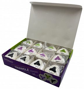 Цвет: ассорти Размер: 40х40х12 мм Наличие европодвеса: Нет Упаковка: дисплей Вид чертежных принадлежностей: Ластик Материал: термопластичная резина Мин. партия и варианты упаковок: 1 / 36 / 864 Ластик INFORMAT TRIANGLE термопластичная резина, 40х40х12 мм треугольный, ассорти, мягкий, пластиковая центровка, индивидуальный ШК