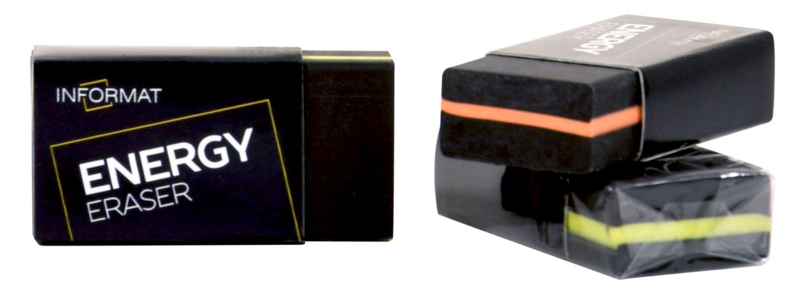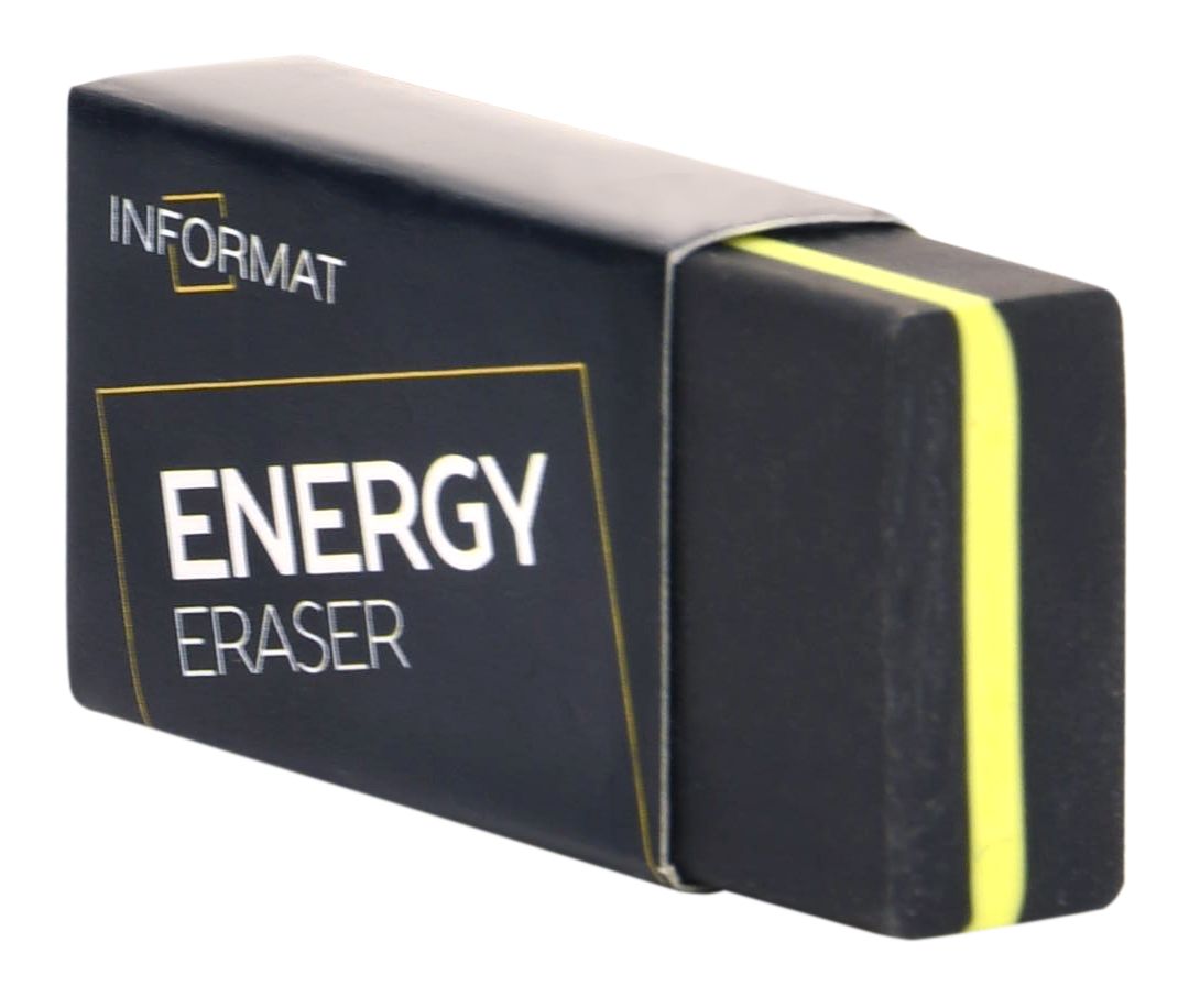 Ластик INFORMAT серии ENERGY эффективно удаляет надписи, выполненные чернографитными карандашами. Благодаря своей мягкой структуре обеспечивает комфортное и легкое стирание, не повреждая бумагу и не оставляя следов пыли.