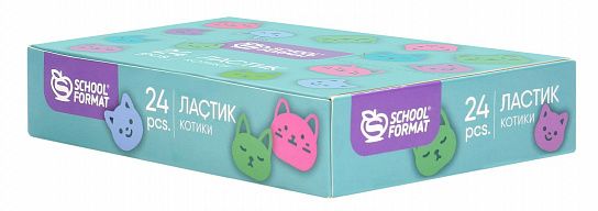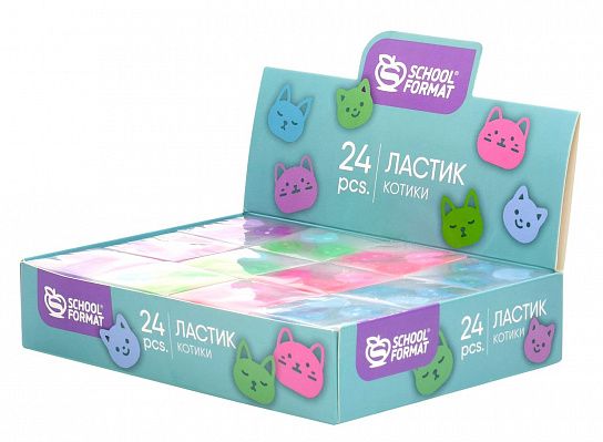 Удобная квадратная форма позволит стирать мелкие детали. Микс из 4 цветов, каждый ластик украшен милейшими мордашками котиков трендовых пастельных оттенков. Красочные и необычные, эти ластики могут похвастаться не только своим оригинальным дизайном, но и практичной компактной формой.Ассорти из 4 дизайнов представлено в ярком картонном дисплее по 24 шт.