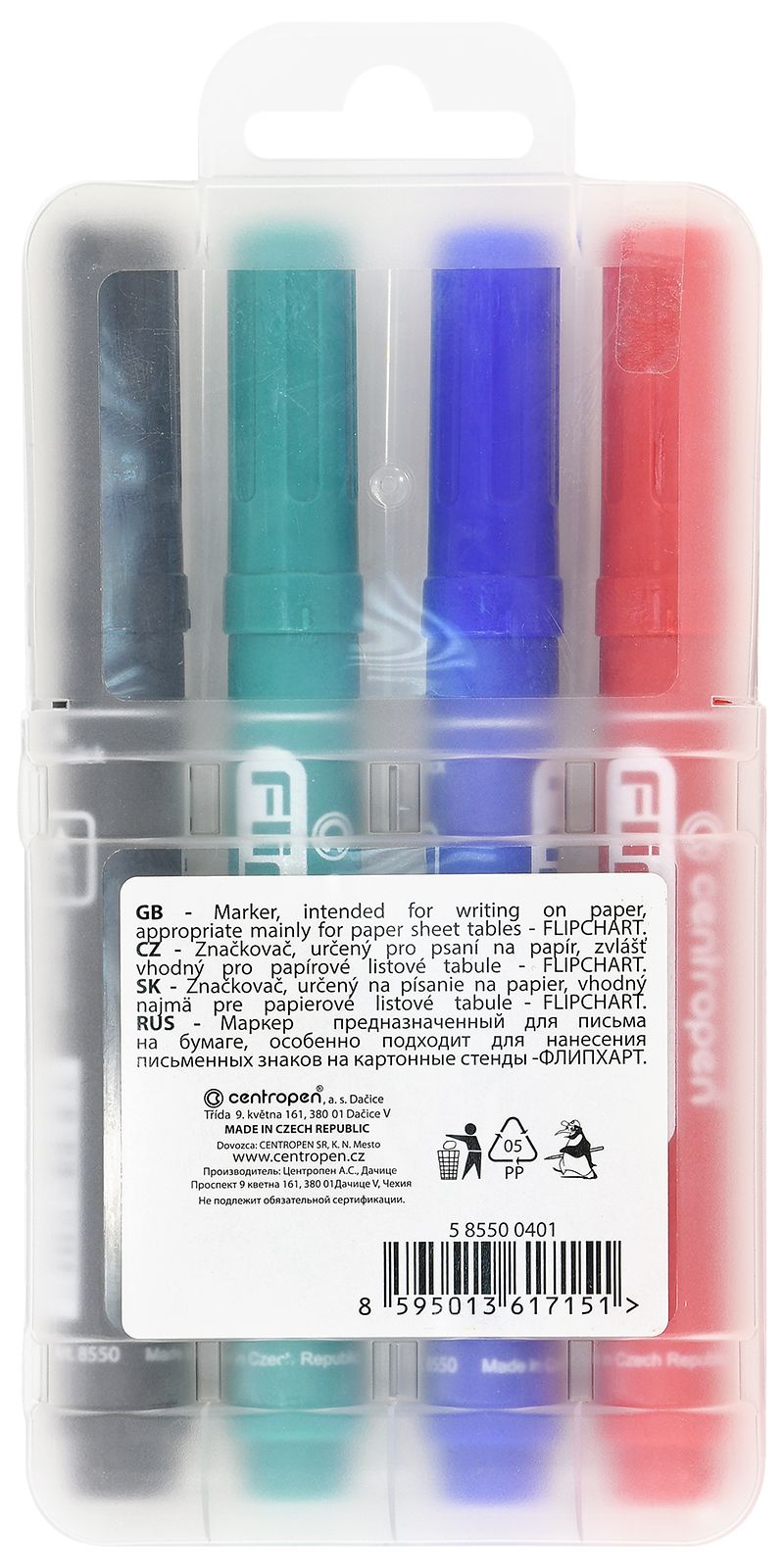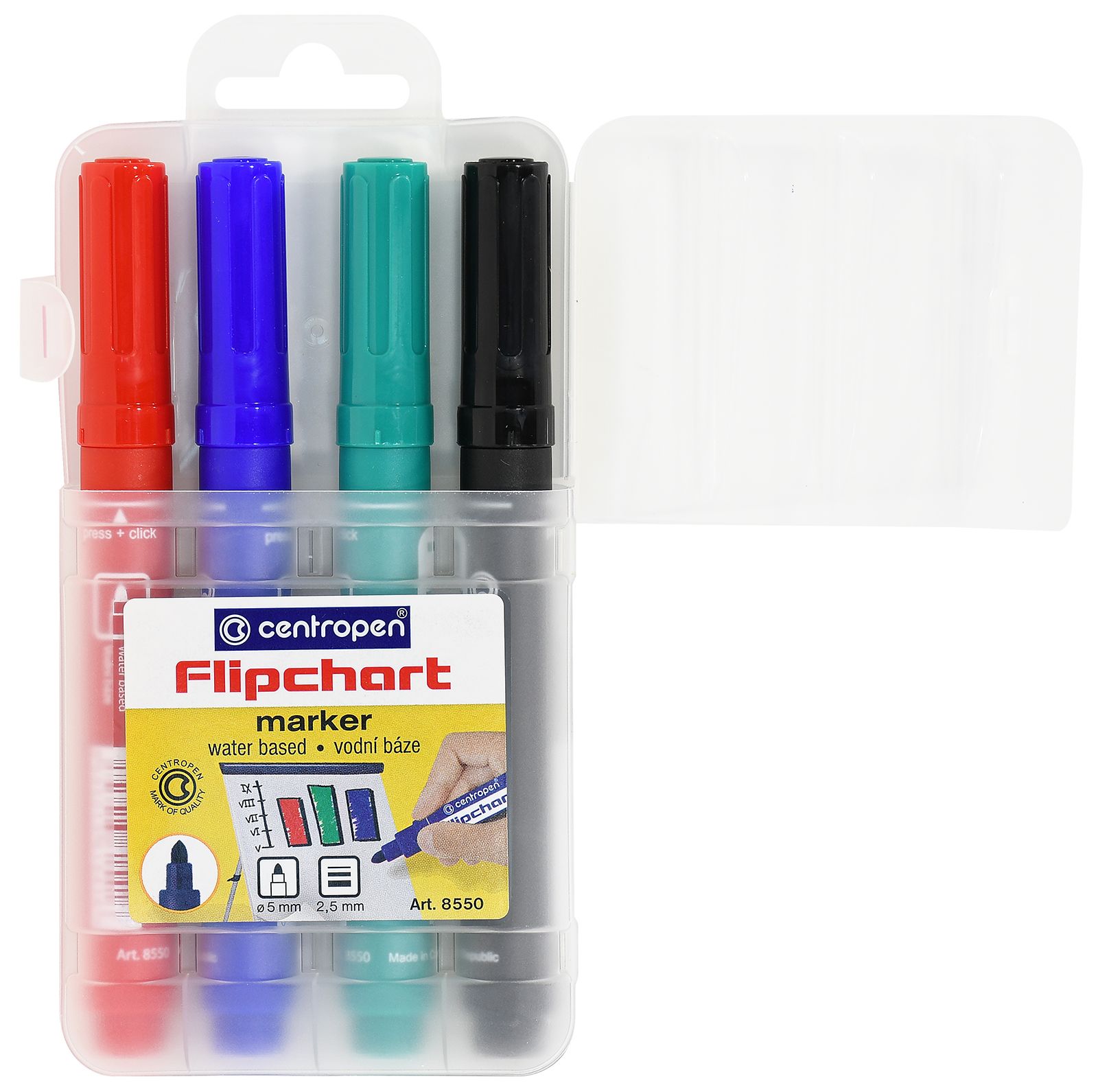 Цвет: ассорти Количество в упаковке, шт: 4 Тип чернил: не просачиваются через бумагу Форма наконечника: круглый Вид маркера: Набор маркеров для флипчартов Количество пишущих сторон: односторонний Мин. партия и варианты упаковок: 1 / 10 / 100 Набор маркеров для флипчартов Centropen FLIPCHART 2,5 мм ассорти, круглый наконечник, 4 шт
