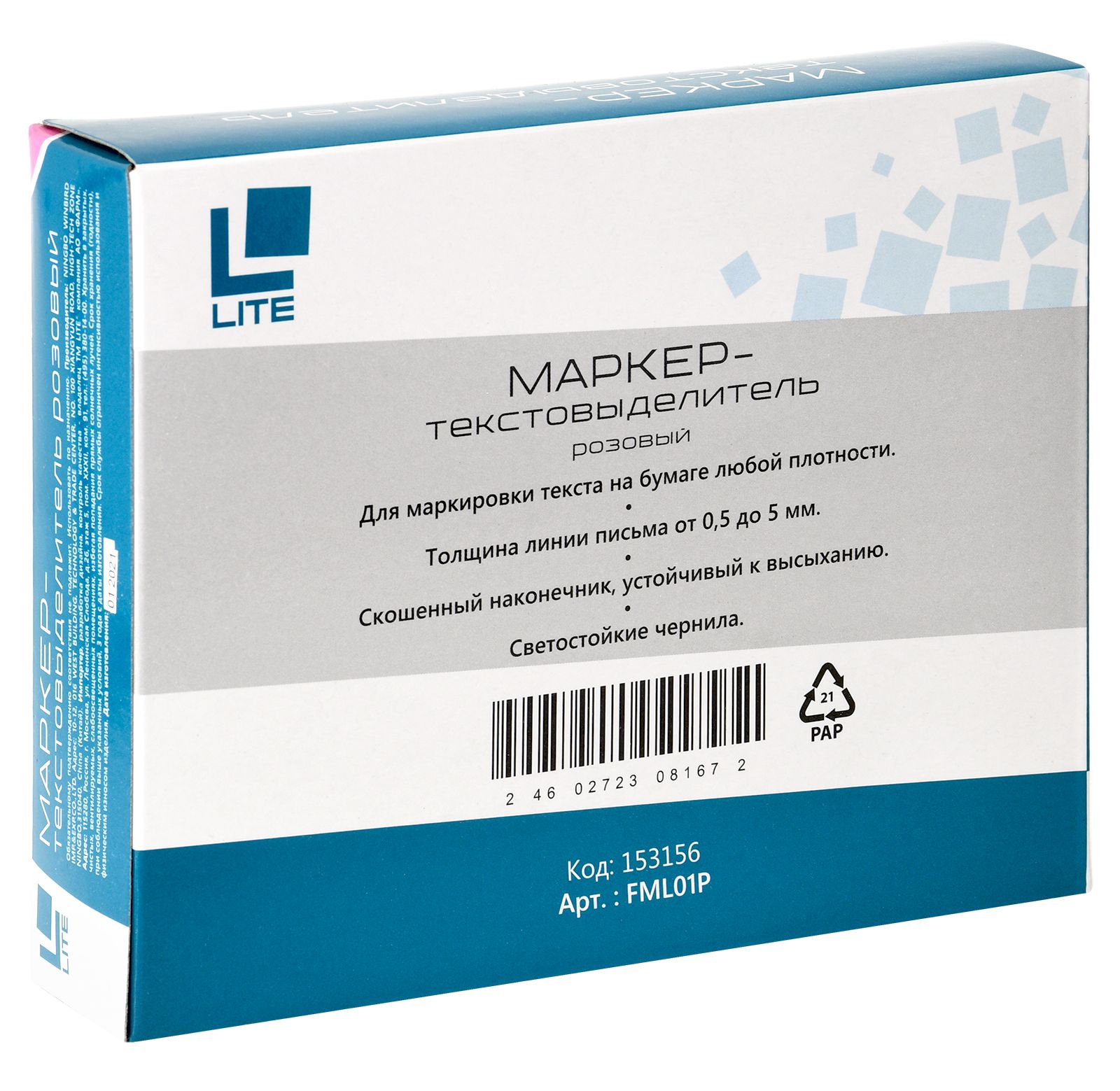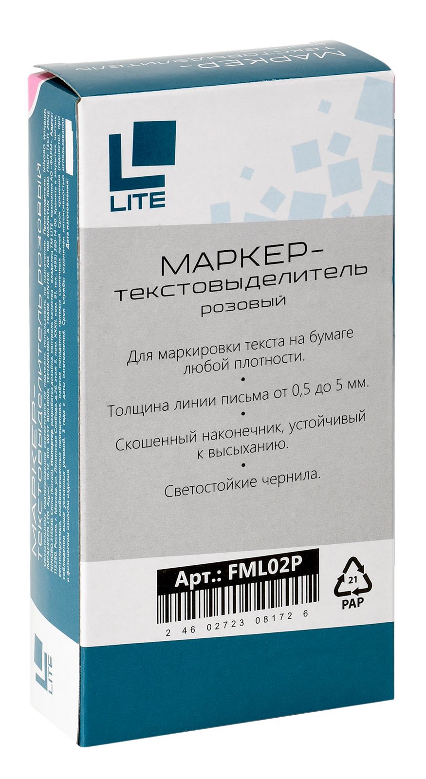 Цвет: розовый Количество в упаковке, шт: 1 Тип чернил: быстросохнущий Форма наконечника: скошенный Вид маркера: Маркер текстовый Количество пишущих сторон: односторонний Мин. партия и варианты упаковок: 1 / 12 / 144 / 864 Маркер текстовый тонкий LITE 0,5-5 мм розовый скошенный 1 шт