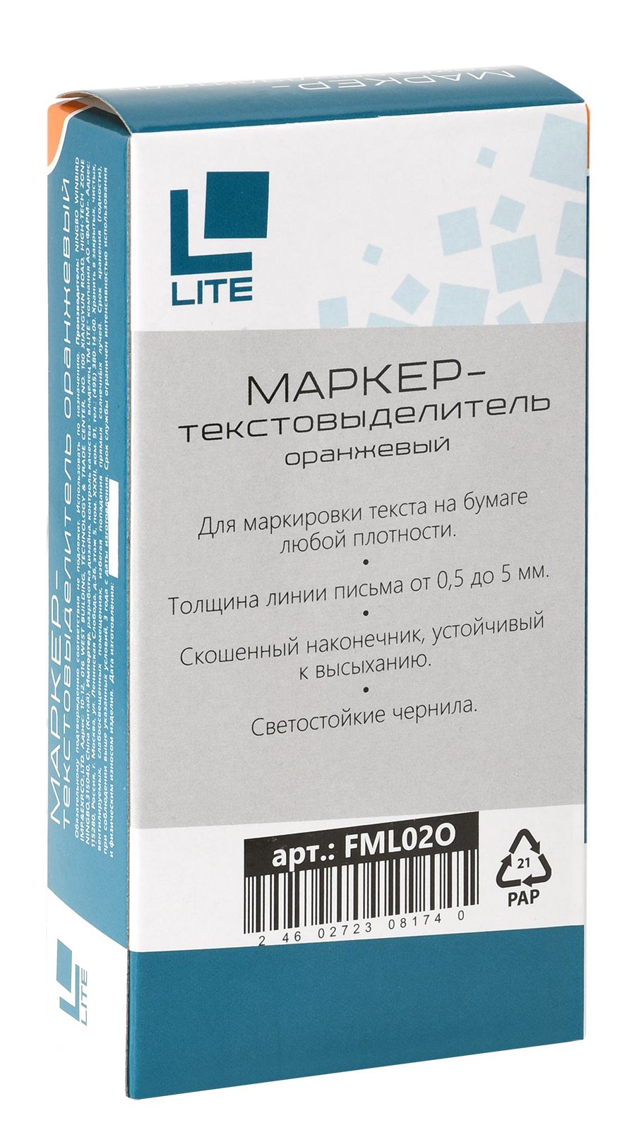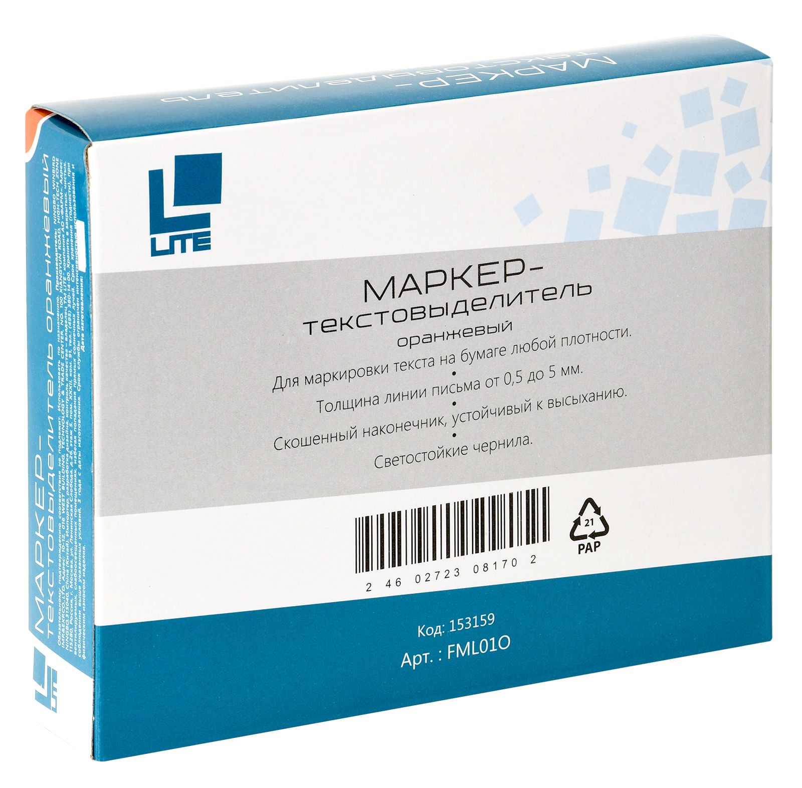 Цвет: оранжевый Количество в упаковке, шт: 1 Тип чернил: быстросохнущий Форма наконечника: скошенный Вид маркера: Маркер текстовый Количество пишущих сторон: односторонний Мин. партия и варианты упаковок: 1 / 144 / 864 Маркер текстовый тонкий LITE 0,5-5 мм оранжевый скошенный 1 шт