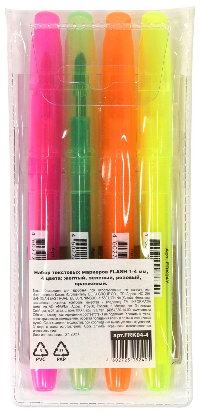 Цвет: ассорти Количество в упаковке, шт: 4 Тип чернил: быстросохнущий Форма наконечника: скошенный Вид маркера: Набор текстовых маркеров Количество пишущих сторон: односторонний Мин. партия и варианты упаковок: 1 / 24 / 288 -
