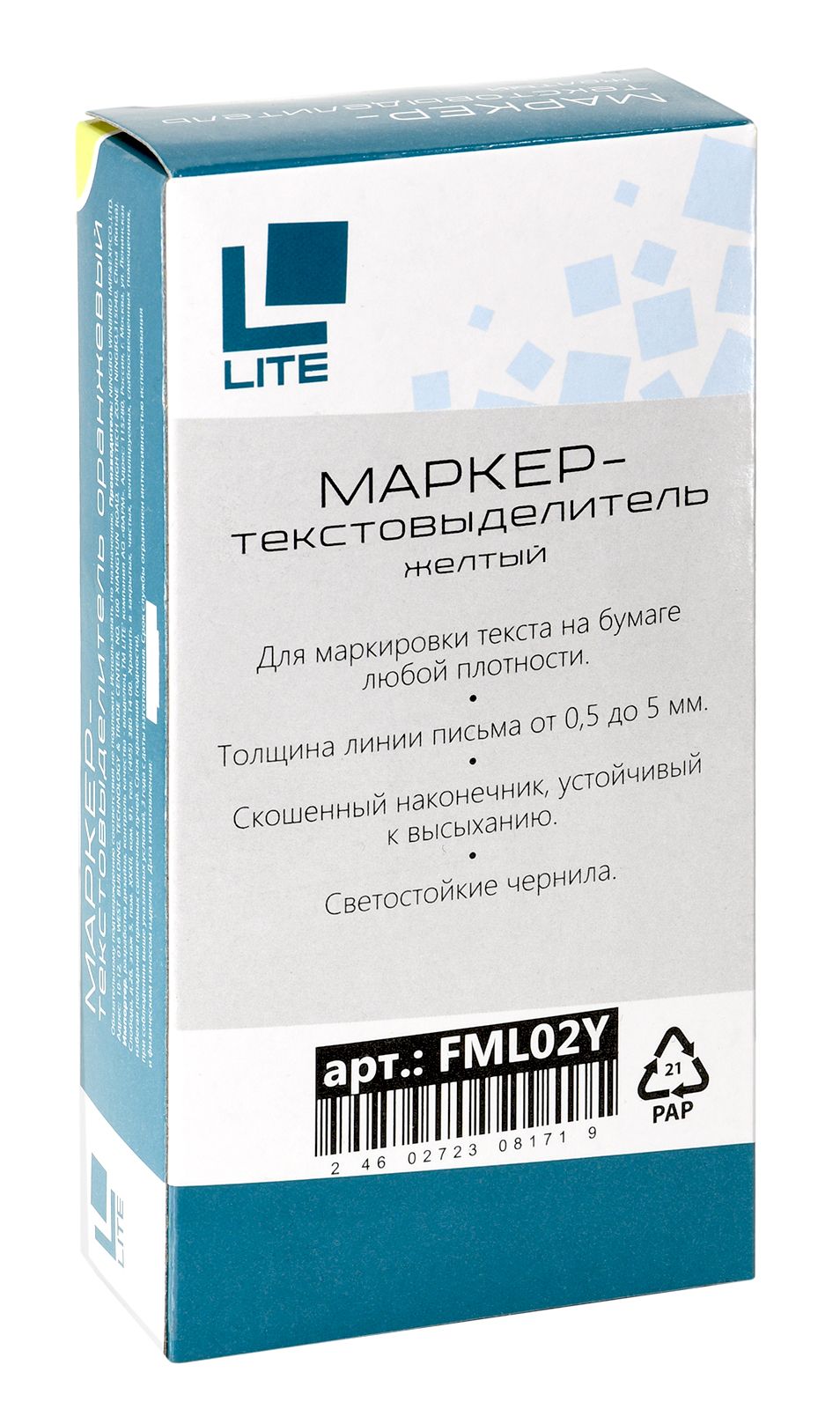 Цвет: желтый Количество в упаковке, шт: 1 Тип чернил: быстросохнущий Форма наконечника: скошенный Вид маркера: Маркер текстовый Количество пишущих сторон: односторонний Мин. партия и варианты упаковок: 1 / 12 / 144 / 864 Маркер текстовый классический LITE 0,5-5 мм желтый скошенный 1 шт