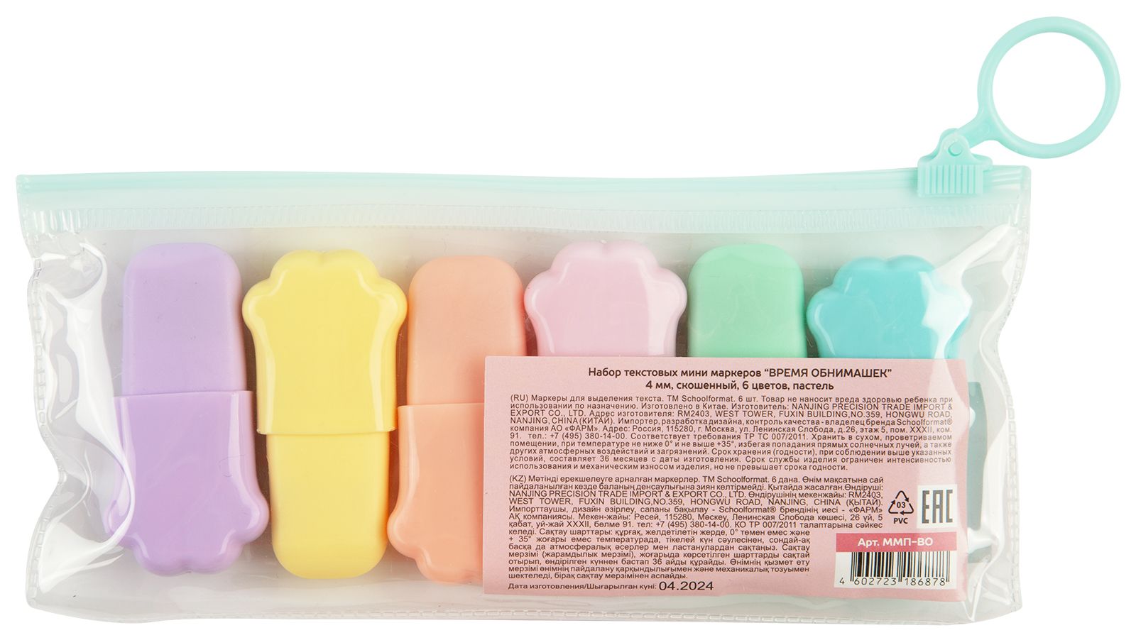 Цвет: ассорти Количество в упаковке, шт: 6 Характеристика цвета: пастель Тип чернил: быстросохнущий Форма наконечника: скошенный Вид маркера: Набор текстовых маркеров мини Мин. партия и варианты упаковок: 1 / 48 / 288 Набор текстовых маркеров мини Schoolformat ВРЕМЯ ОБНИМАШЕК 1-4 мм ассорти пастель скошенный принт на корпусе 6 шт