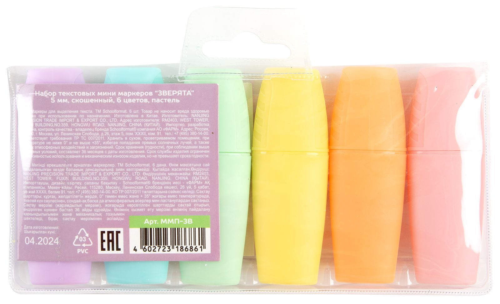 Цвет: ассорти Количество в упаковке, шт: 6 Характеристика цвета: пастель Тип чернил: быстросохнущий Форма наконечника: скошенный Вид маркера: Набор текстовых маркеров Мин. партия и варианты упаковок: 1 / 24 / 144 -