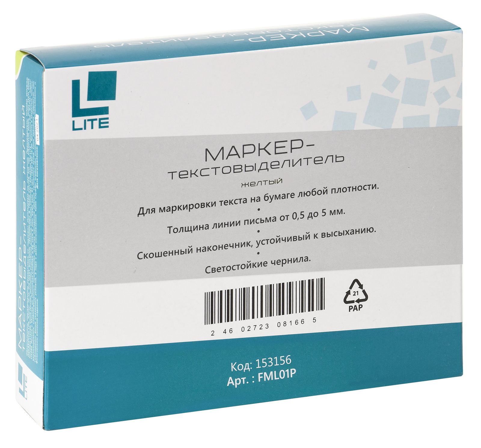 Цвет: желтый Количество в упаковке, шт: 1 Тип чернил: быстросохнущий Форма наконечника: скошенный Вид маркера: Маркер текстовый Количество пишущих сторон: односторонний Мин. партия и варианты упаковок: 1 / 12 / 144 / 864 Маркер текстовый классический LITE 0,5-5 мм желтый скошенный 1 шт