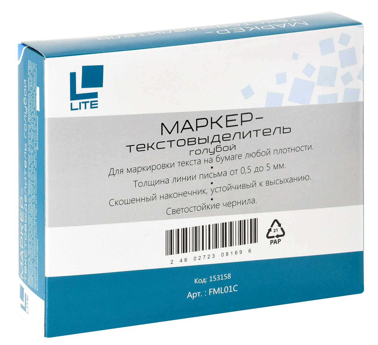 Цвет: голубой Количество в упаковке, шт: 1 Тип чернил: быстросохнущий Форма наконечника: скошенный Вид маркера: Маркер текстовый Количество пишущих сторон: односторонний Мин. партия и варианты упаковок: 1 / 12 / 144 / 864 Маркер текстовый классический LITE 0,5-5 мм голубой скошенный 1 шт