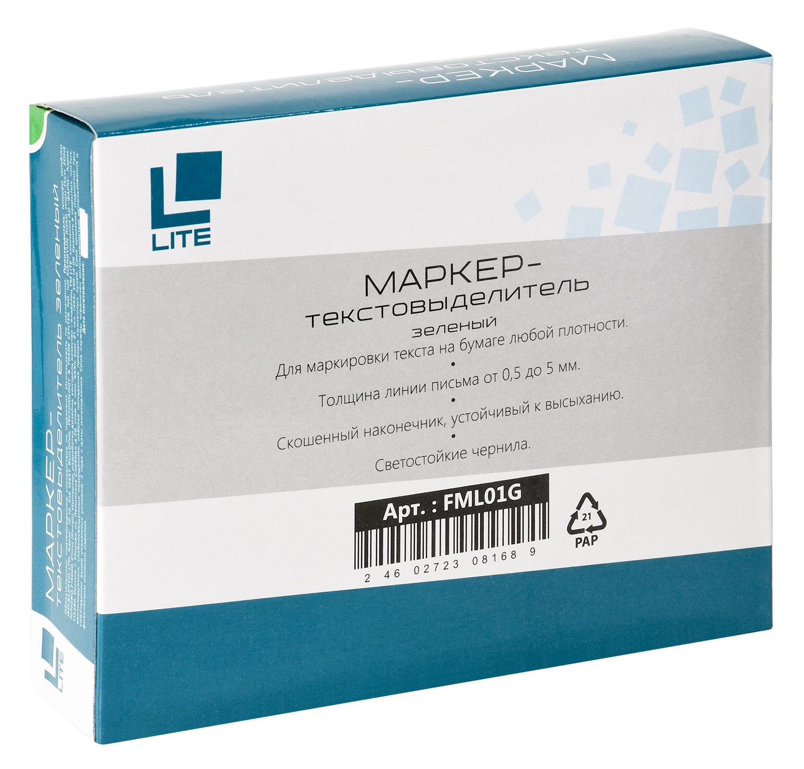Цвет: зеленый Количество в упаковке, шт: 1 Тип чернил: быстросохнущий Форма наконечника: скошенный Вид маркера: Маркер текстовый Количество пишущих сторон: односторонний Мин. партия и варианты упаковок: 1 / 12 / 144 / 864 Маркер текстовый классический LITE 0,5-5 мм зеленый скошенный 1 шт