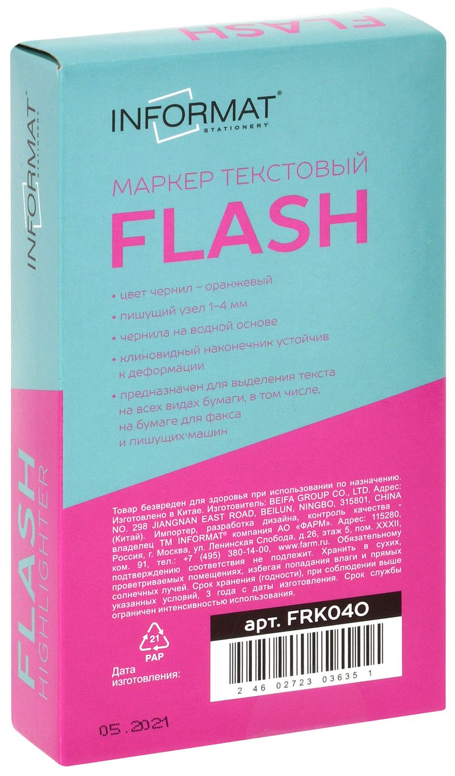 Цвет: оранжевый Количество в упаковке, шт: 1 Тип чернил: быстросохнущий Форма наконечника: скошенный Вид маркера: Маркер текстовый Количество пишущих сторон: односторонний Мин. партия и варианты упаковок: 1 / 12 / 144 / 864 Маркер текстовый INFORMAT FLASH 1—4 мм, оранжевый, скошенный