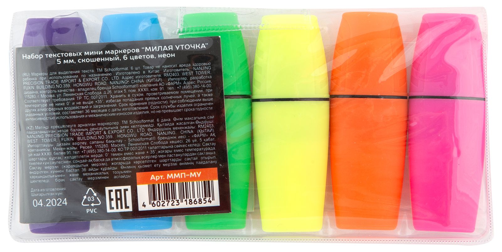 Цвет: ассорти Количество в упаковке, шт: 6 Тип чернил: быстросохнущий Форма наконечника: скошенный Вид маркера: Набор текстовых маркеров мини Количество пишущих сторон: односторонний Мин. партия и варианты упаковок: 1 / 40 / 240 Набор текстовых маркеров мини Schoolformat МИЛАЯ УТОЧКА 1-5 мм ассорти скошенный принт на корпусе 6 шт