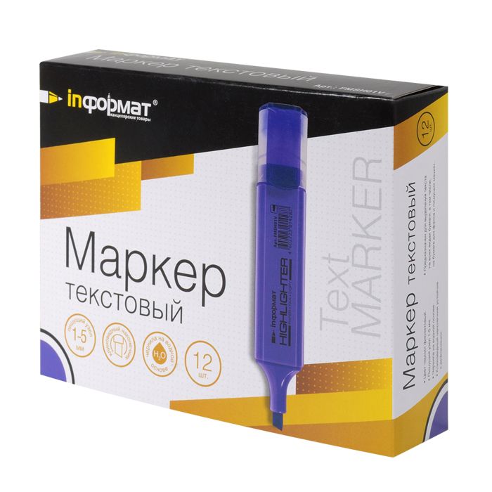 Цвет: фиолетовый Количество в упаковке, шт: 1 Тип чернил: быстросохнущий Форма наконечника: скошенный Вид маркера: Маркер текстовый Количество пишущих сторон: односторонний Мин. партия и варианты упаковок: 1 / 12 / 144 / 864 -