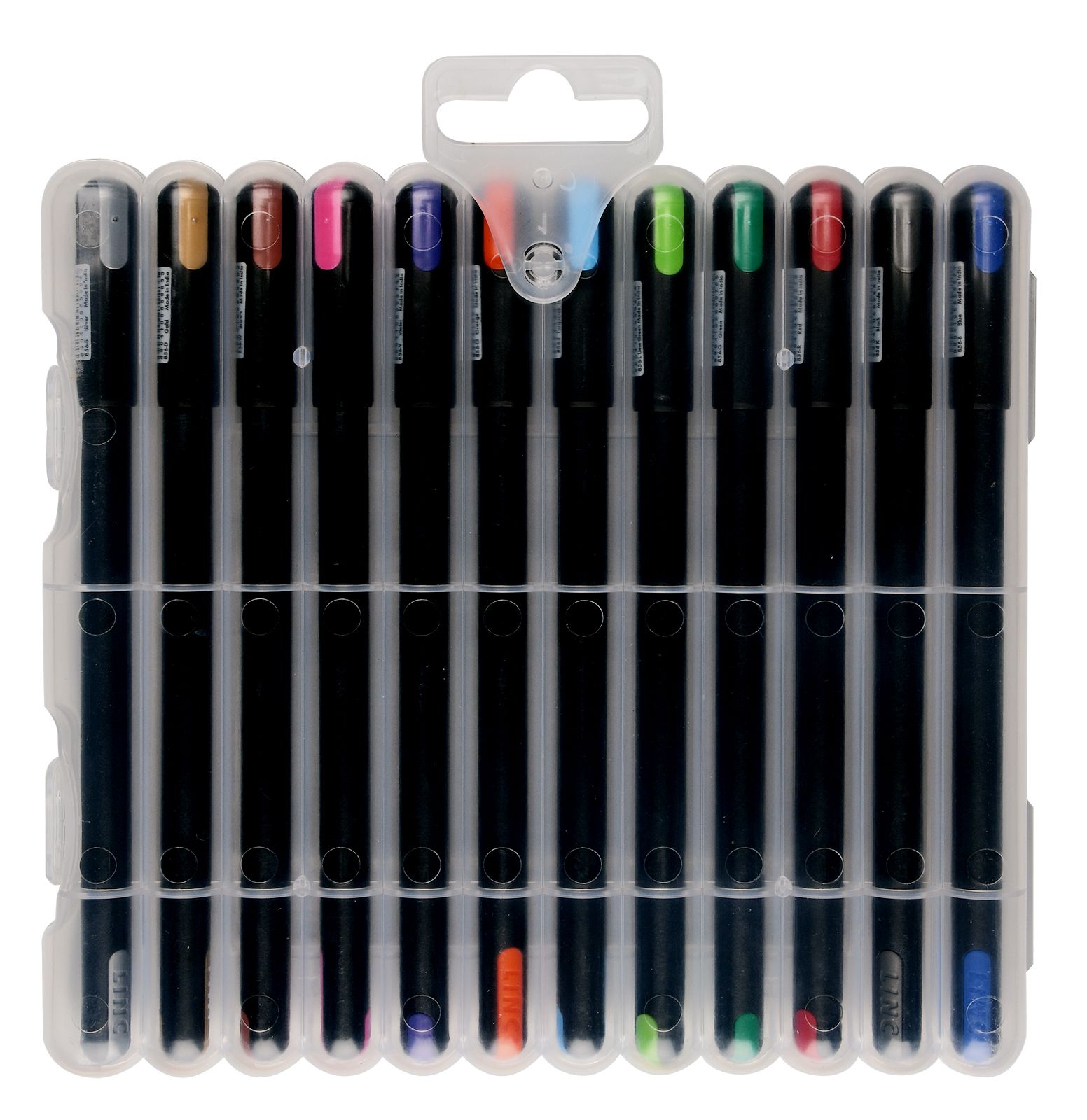 Количество в упаковке, шт: 12 Диаметр, мм: 9 Цвет чернил: ассорти Количество цветов: 12 Толщина линии письма, мм: 0,30 Цвет корпуса: черный Мин. партия и варианты упаковок: 1 / 10 / 100 Набор гелевых ручек LINC PENTONIC 0,6/ 0,7/ 1 мм ассорти 12 цветов 12 шт
