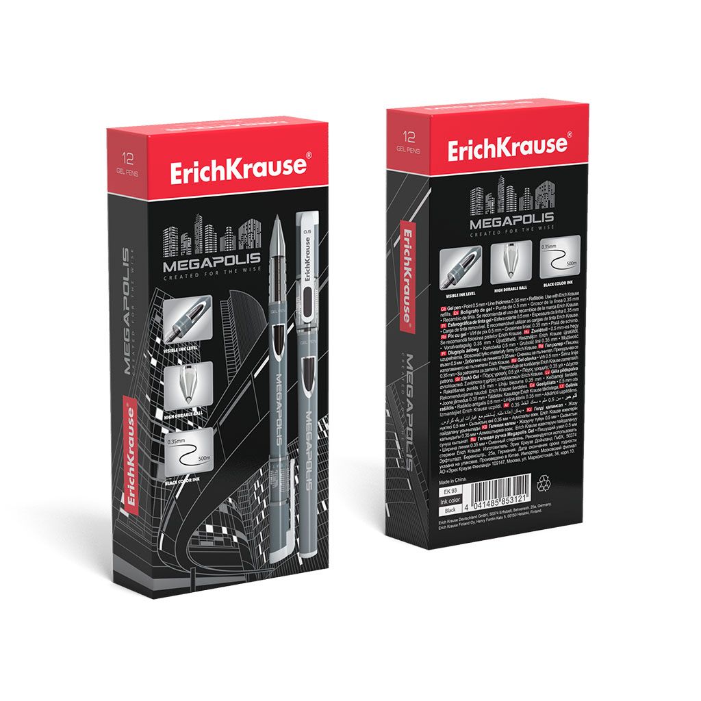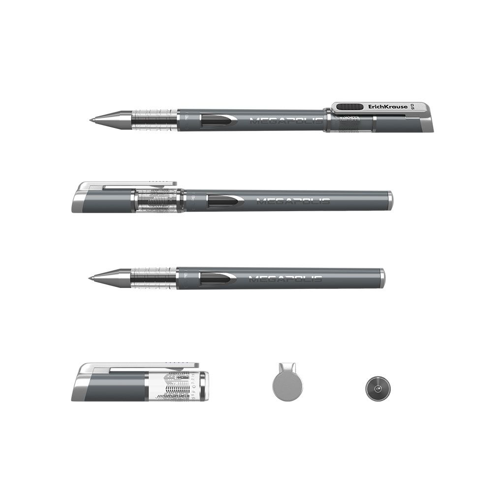 Диаметр, мм: 10 Цвет чернил: черный Вид товара: Ручка гелевая Толщина линии письма, мм: 0,35 Цвет корпуса: серый Наличие резинового грипа: Нет Мин. партия и варианты упаковок: 1 / 12 / 144 / 1728 Ручка гелевая ErichKrause MEGAPOLIS GEL 0,5 мм черная, круглый корпус