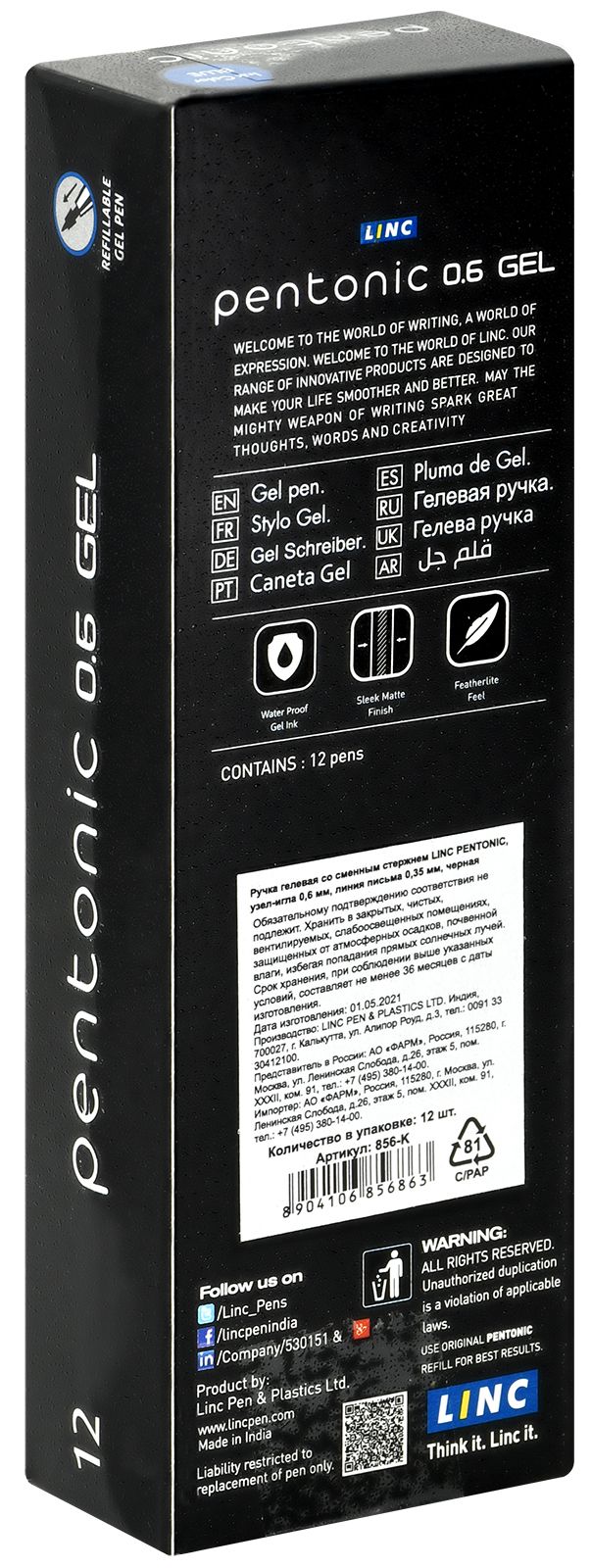 Диаметр, мм: 7 Цвет чернил: черный Вид товара: Ручка гелевая Цвет корпуса: черный Наличие резинового грипа: Нет Упаковка: картонная коробка Мин. партия и варианты упаковок: 1 / 12 / 120 / 1200 Ручка гелевая Linc PENTONIC 0,6 мм черная, круглый корпус