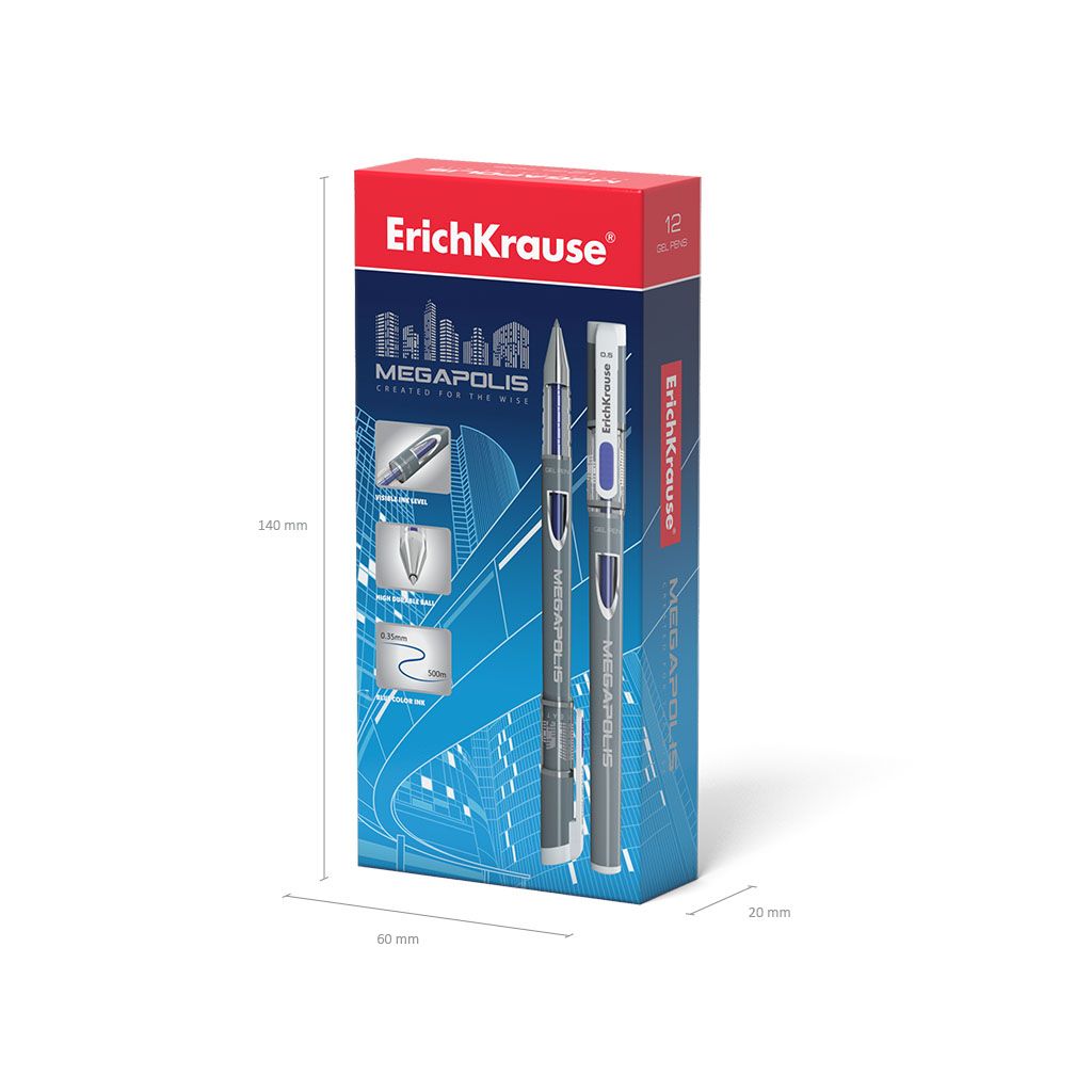 Диаметр, мм: 10 Цвет чернил: синий Вид товара: Ручка гелевая Толщина линии письма, мм: 0,35 Цвет корпуса: серый Наличие резинового грипа: Нет Мин. партия и варианты упаковок: 1 / 12 / 144 / 1728 Ручка гелевая ErichKrause MEGAPOLIS GEL 0,5 мм синяя, круглый корпус