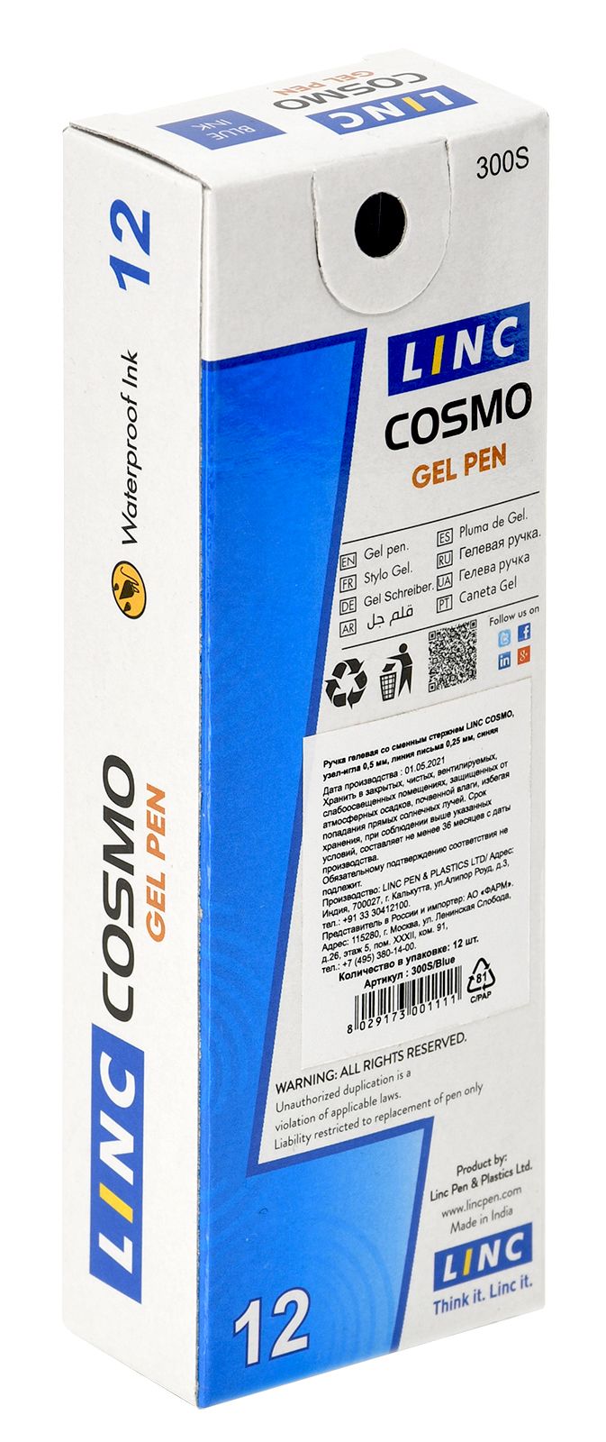 Диаметр, мм: 9 Цвет чернил: синий Вид товара: Ручка гелевая Толщина линии письма, мм: 0,30 Цвет корпуса: прозрачный Наличие резинового грипа: Нет Мин. партия и варианты упаковок: 1 / 12 / 72 / 864 Ручка гелевая Linc COSMO 0,5 мм синяя, круглый корпус