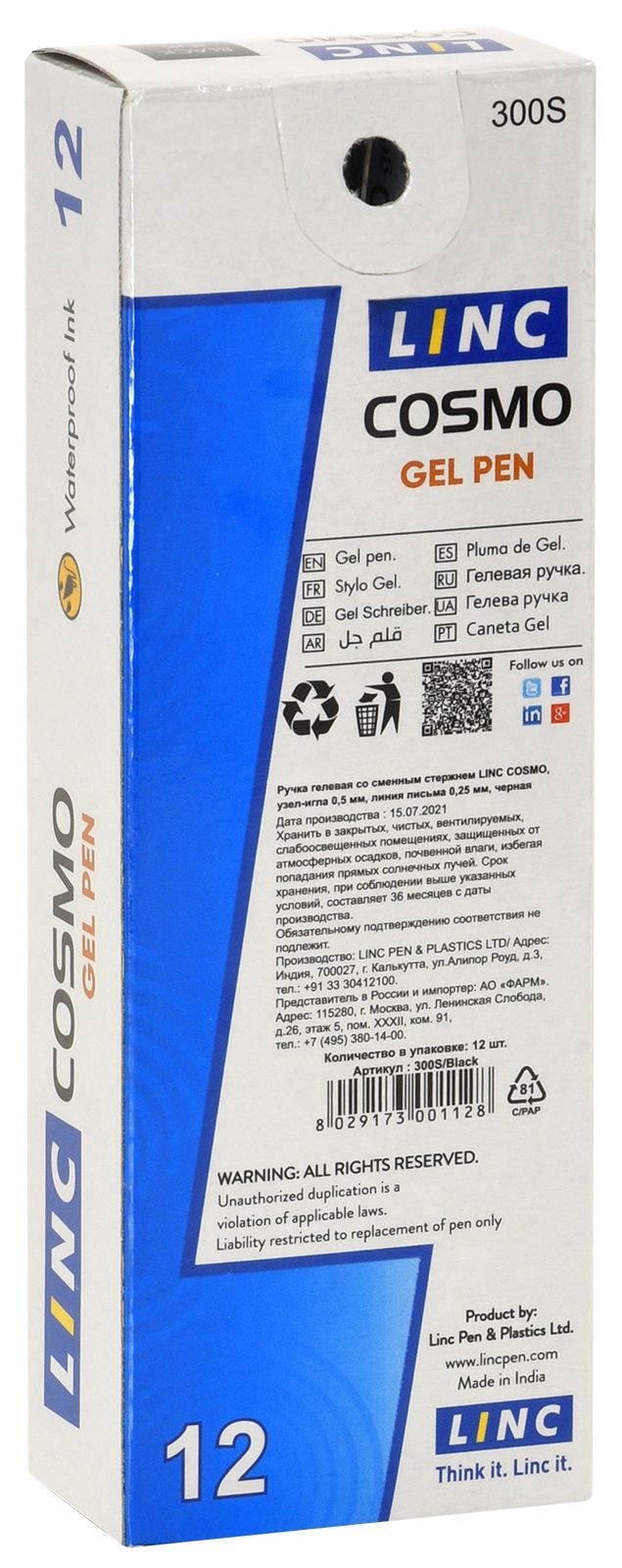 Диаметр, мм: 9 Цвет чернил: черный Вид товара: Ручка гелевая Толщина линии письма, мм: 0,30 Цвет корпуса: прозрачный Наличие резинового грипа: Нет Мин. партия и варианты упаковок: 1 / 12 / 72 / 864 Ручка гелевая Linc COSMO 0,5 мм черная, круглый корпус