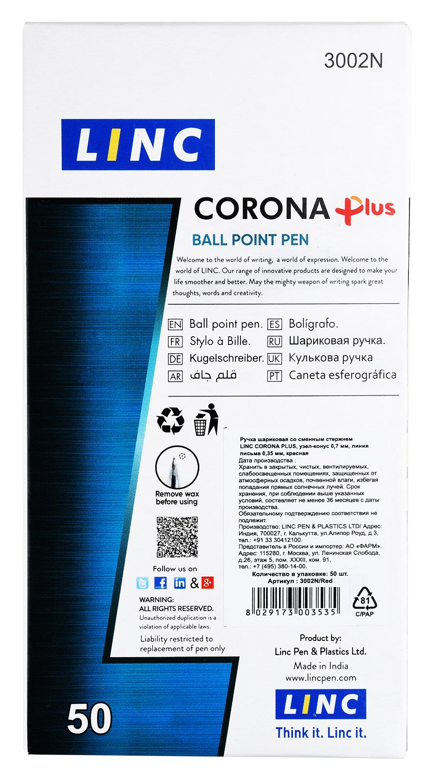 Цвет чернил: красный Толщина линии письма, мм: 0,35 Цвет корпуса: прозрачный Наличие резинового грипа: Нет Упаковка: картонная коробка Профиль корпуса: шестигранный корпус Мин. партия и варианты упаковок: 1 / 50 / 1000 Ручка шариковая Linc CORONA PLUS красная 0,7 мм, прозрачный шестигранный корпус