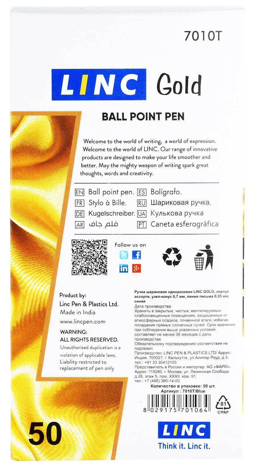 Цвет чернил: синий Толщина линии письма, мм: 0,35 Цвет корпуса: ассорти Наличие резинового грипа: Нет Упаковка: картонная коробка Профиль корпуса: круглый корпус Мин. партия и варианты упаковок: 1 / 50 / 2000 Ручка шариковая Linc GOLD синяя 0,7 мм, ассорти круглый корпус