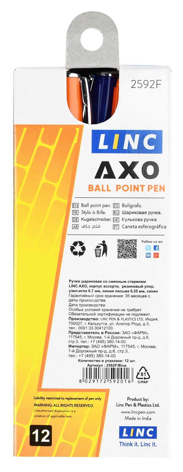 Цвет чернил: синий Толщина линии письма, мм: 0,35 Цвет корпуса: ассорти Наличие резинового грипа: Да Упаковка: картонная коробка Профиль корпуса: круглый корпус Мин. партия и варианты упаковок: 1 / 12 / 72 / 1728 Ручка шариковая Linc Axo синяя 0,7 мм, ассорти круглый корпус, грип, игольчатый наконечник