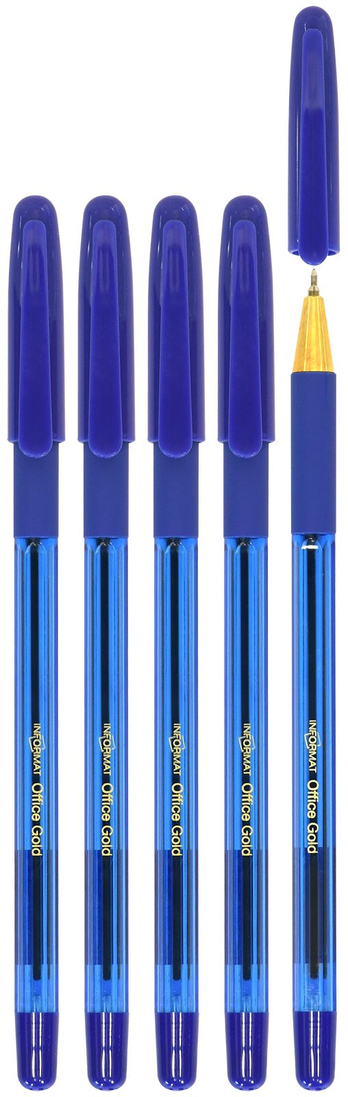 Цвет чернил: синий Толщина линии письма, мм: 0,25 Цвет корпуса: прозрачно-синий Наличие резинового грипа: Да Упаковка: картонная коробка Профиль корпуса: круглый корпус Мин. партия и варианты упаковок: 1 / 12 / 144 / 1728 Ручка шариковая на масляной основе INFORMAT Office Gold Blue синяя 0,5 мм, прозрачно-синий круглый корпус, грип, игольчатый наконечник