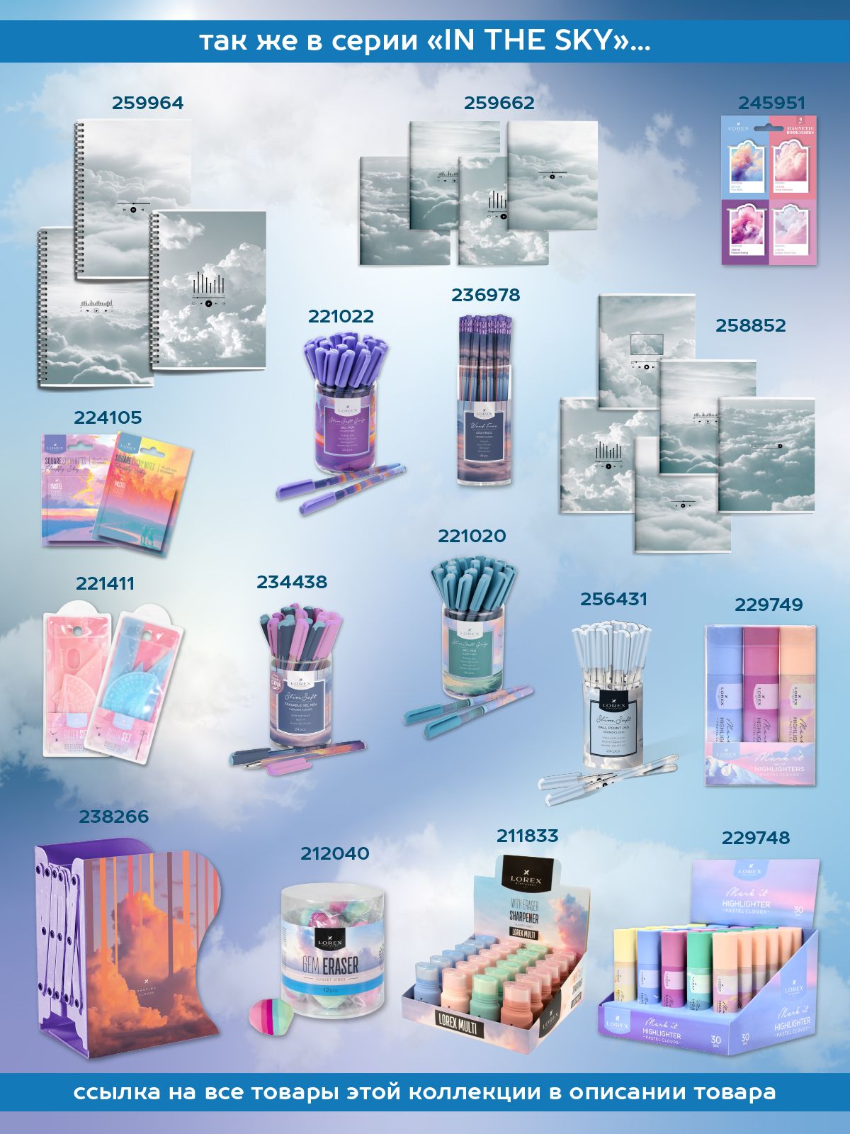 Количество в упаковке, шт: 1 Диаметр, мм: 7 Цвет чернил: синий Вид товара: Ручка гелевая стираемая Толщина линии письма, мм: 0,35 Цвет корпуса: ассорти Мин. партия и варианты упаковок: 1 / 24 / 288 / 1728 Ручка гелевая стираемая LOREX Slim Soft HANGING CLOUDS 0,5 мм синяя, покрытие ultra-soft touch