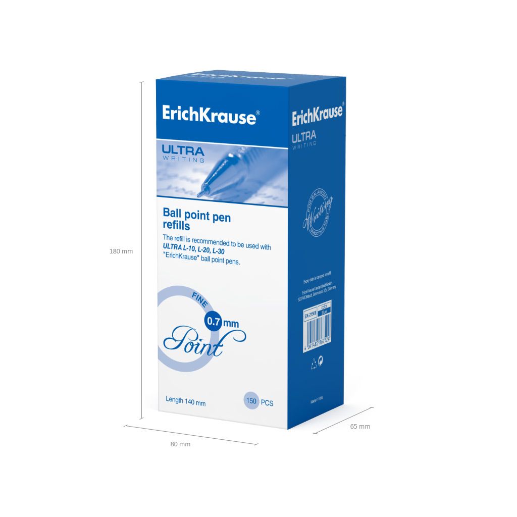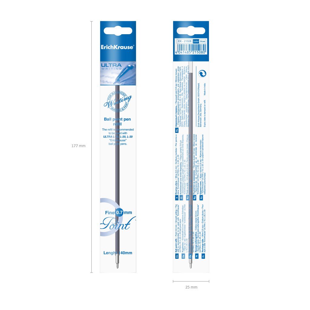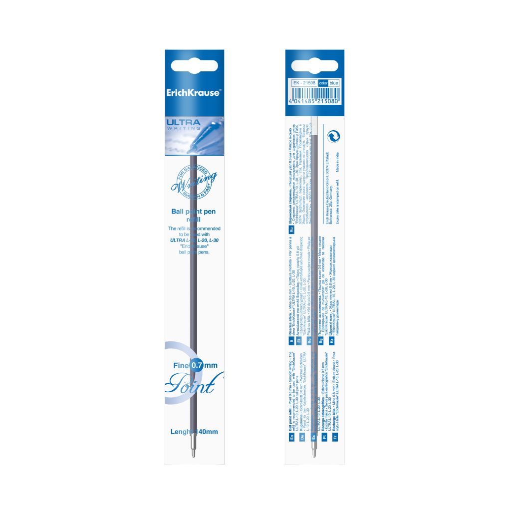 Цвет чернил: синий Форма наконечника: игольчатый Толщина линии письма, мм: 0,35 Упаковка: пакет с европодвесом Длина стержня, мм: 140 Пишущий узел, мм: 0,70 Мин. партия и варианты упаковок: 1 / 150 / 600 / 2400 Стержень шариковый ErichKrause ULTRA синий 140 мм 0,7 мм корпус пластик