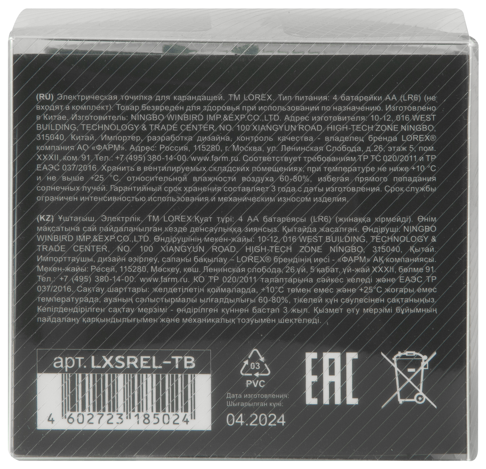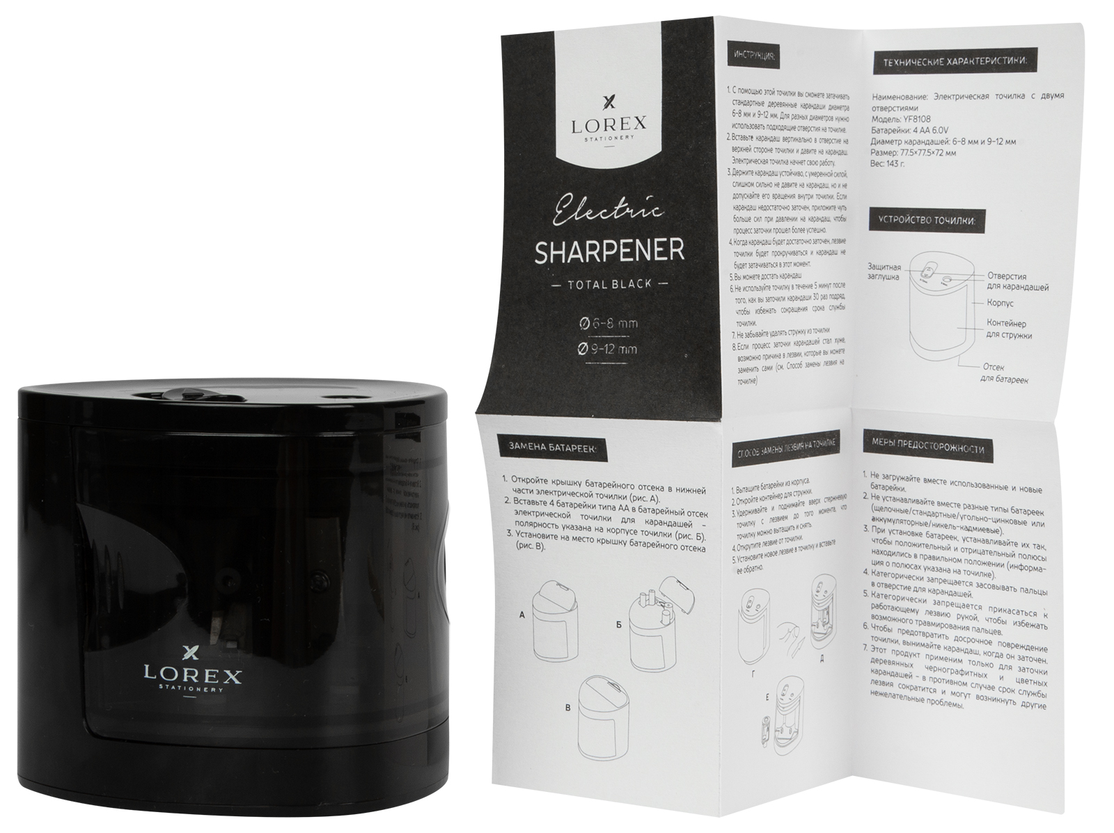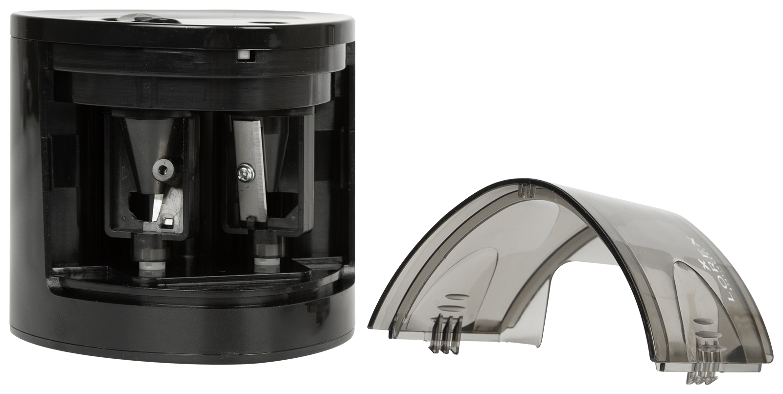 Цвет: черный Комплектация: с контейнером Вид точилки: электрическая Количество отверстий для заточки: 2 отверстия Серия: TOTAL BLACK Материал механизма: металл Мин. партия и варианты упаковок: 1 / 12 / 72 Точилка электрическая LOREX TOTAL BLACK, корпус пластиковый, черная
