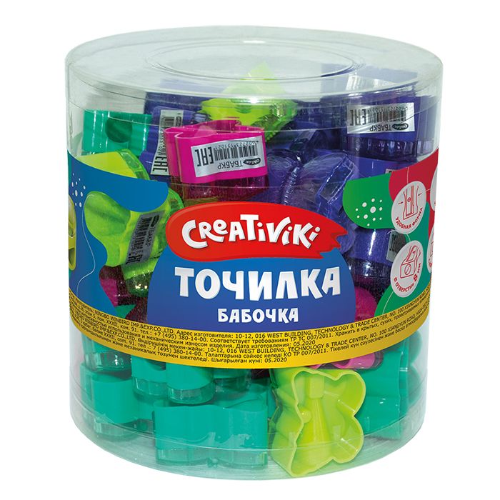 Цвет: ассорти Упаковка: тубус Комплектация: с контейнером Наличие индивидуального штрих-кода: Да Форма: фигурная Количество отверстий для заточки: 1 отверстие Мин. партия и варианты упаковок: 1 / 48 / 1440 / 2880 Точилка Creativiki БАБОЧКИ с контейнером, ассорти, корпус пластик, 1 отверстие, в тубусе