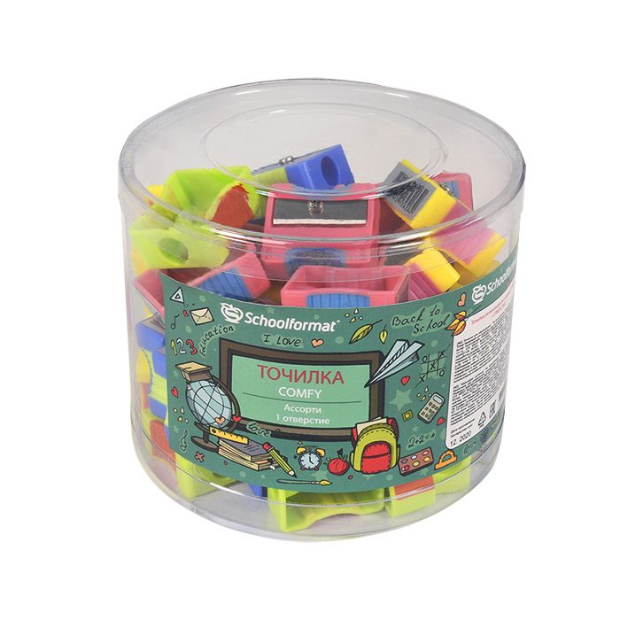 Цвет: ассорти Упаковка: тубус Наличие индивидуального штрих-кода: Да Форма: фигурная Количество отверстий для заточки: 1 отверстие Серия: Comfy Мин. партия и варианты упаковок: 1 / 48 / 1440 / 2880 Точилка Schoolformat Comfy ассорти, корпус пластик, 1 отверстие, резиновые вставки, в тубусе