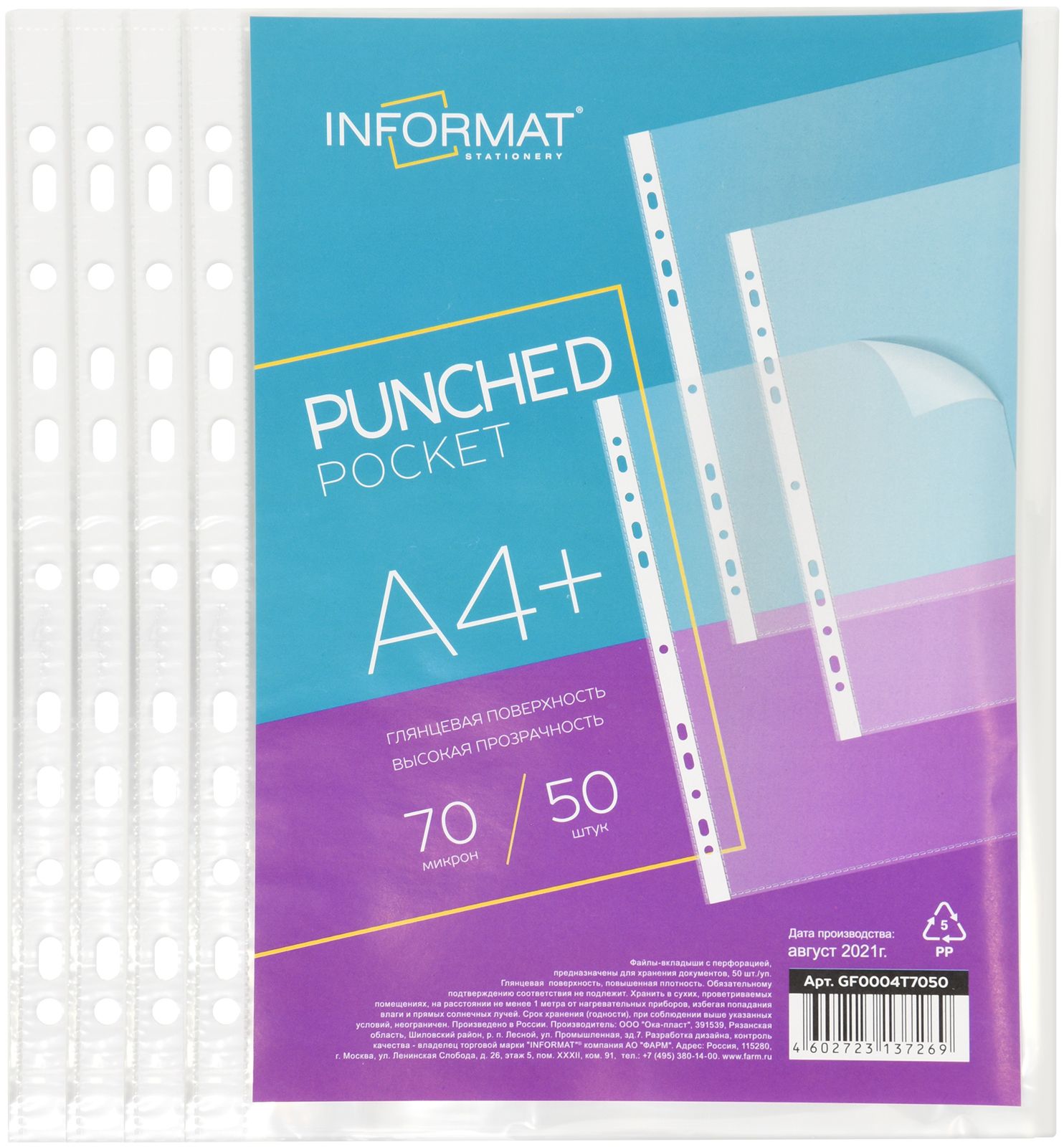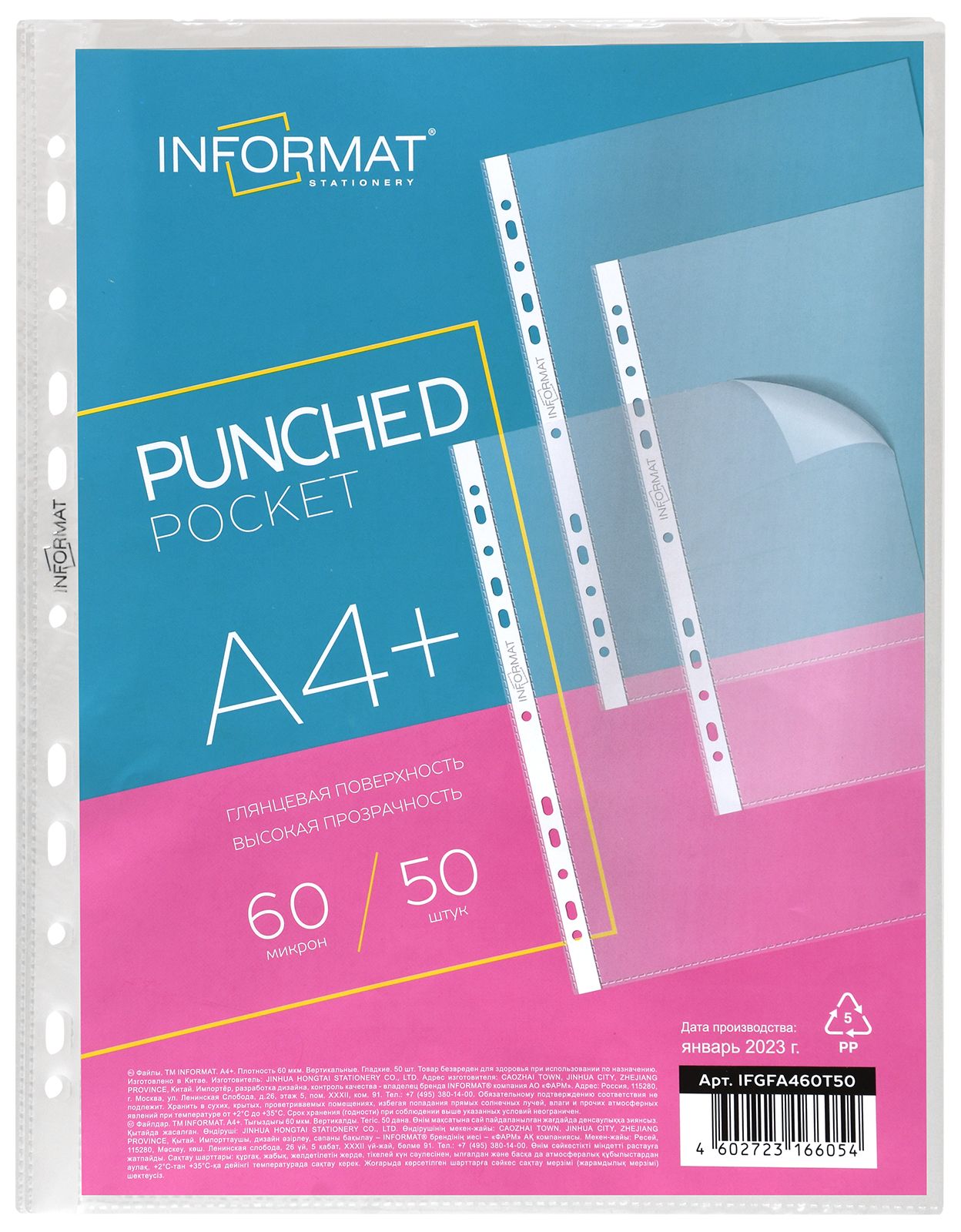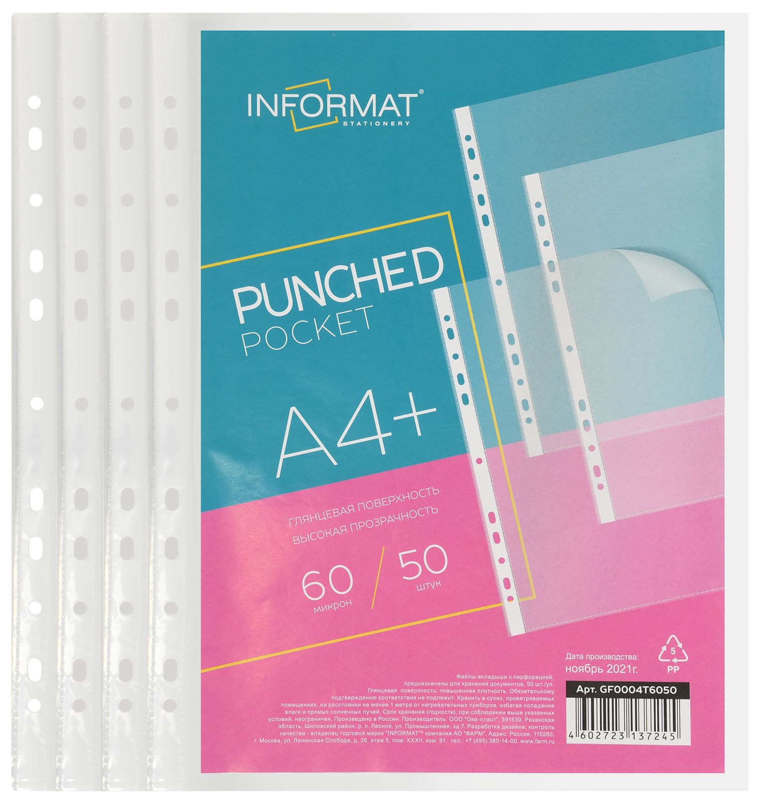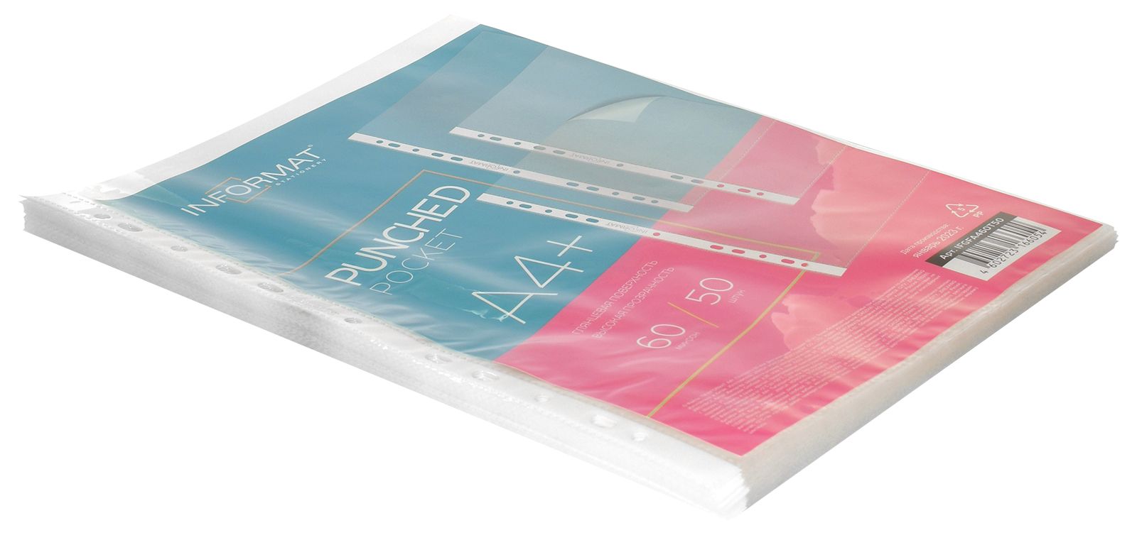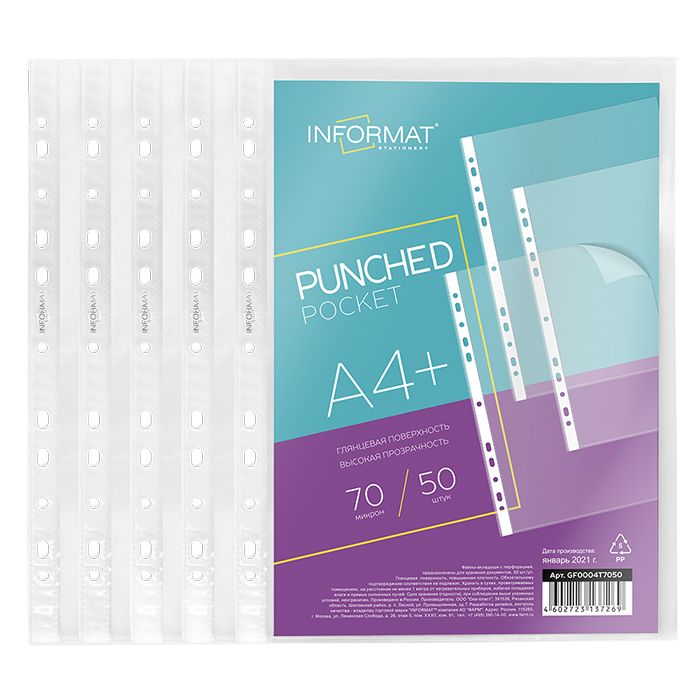 Цвет: прозрачный Ориентация: вертикальный Формат: А4+ Вместимость листов: 50 Толщина, мкм: 70 Фактура файла: гладкий Мин. партия и варианты упаковок: 1 / 35 Файлы INFORMAT А4+ 70 мкм плотные, прозрачные, гладкие, 50 шт