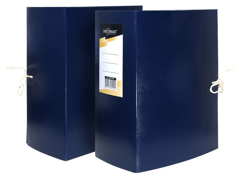 Формат: А4 Цвет: синий Материал: бумвинил Вид изделия: Короб архивный Способ закрытия: 2 завязки Конструкция: разобранный Мин. партия и варианты упаковок: 1 / 10 Короб архивный INFORMAT 140 мм А4 синий бумвинил, 2 завязки, вместимость до 1400 листов разобранный