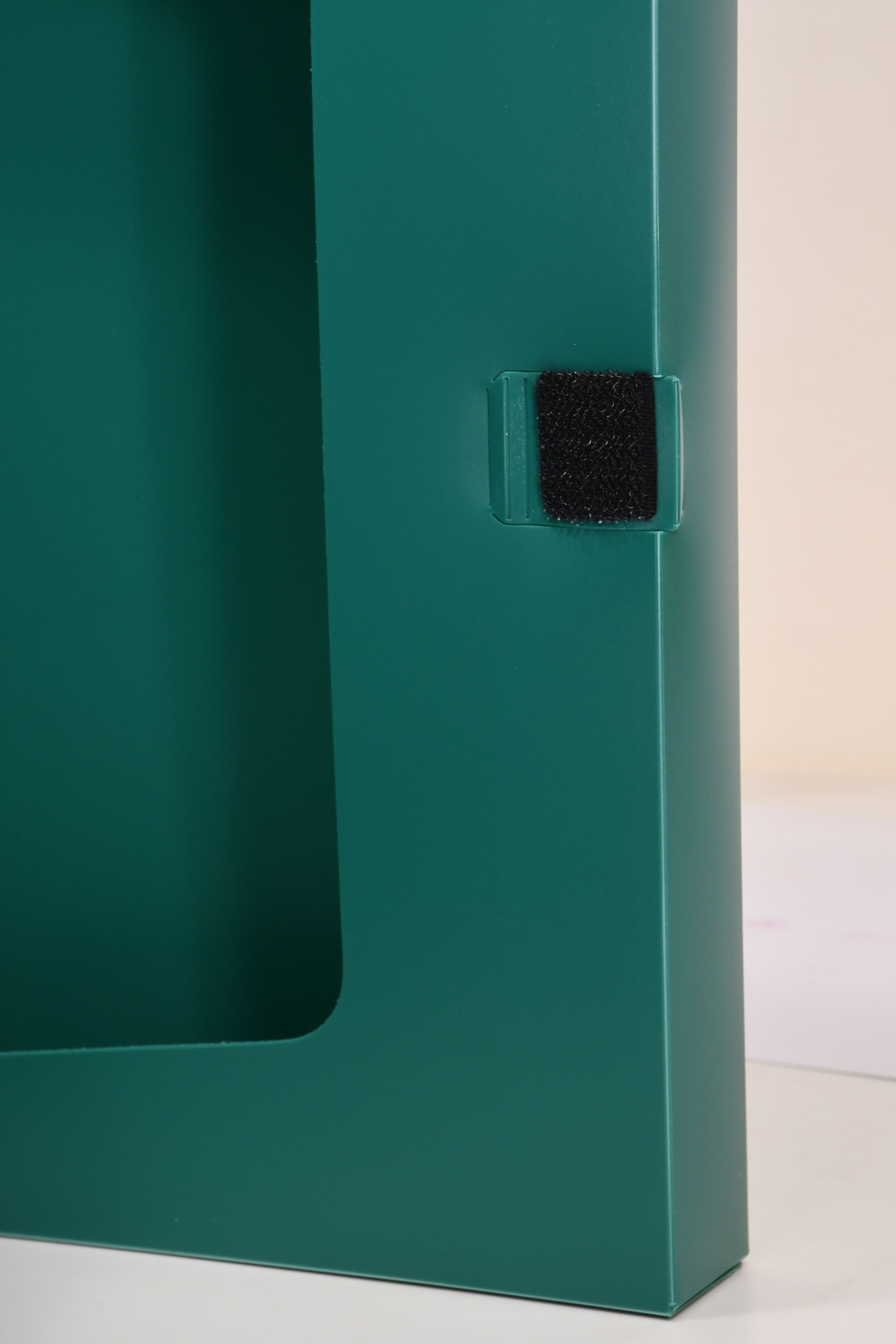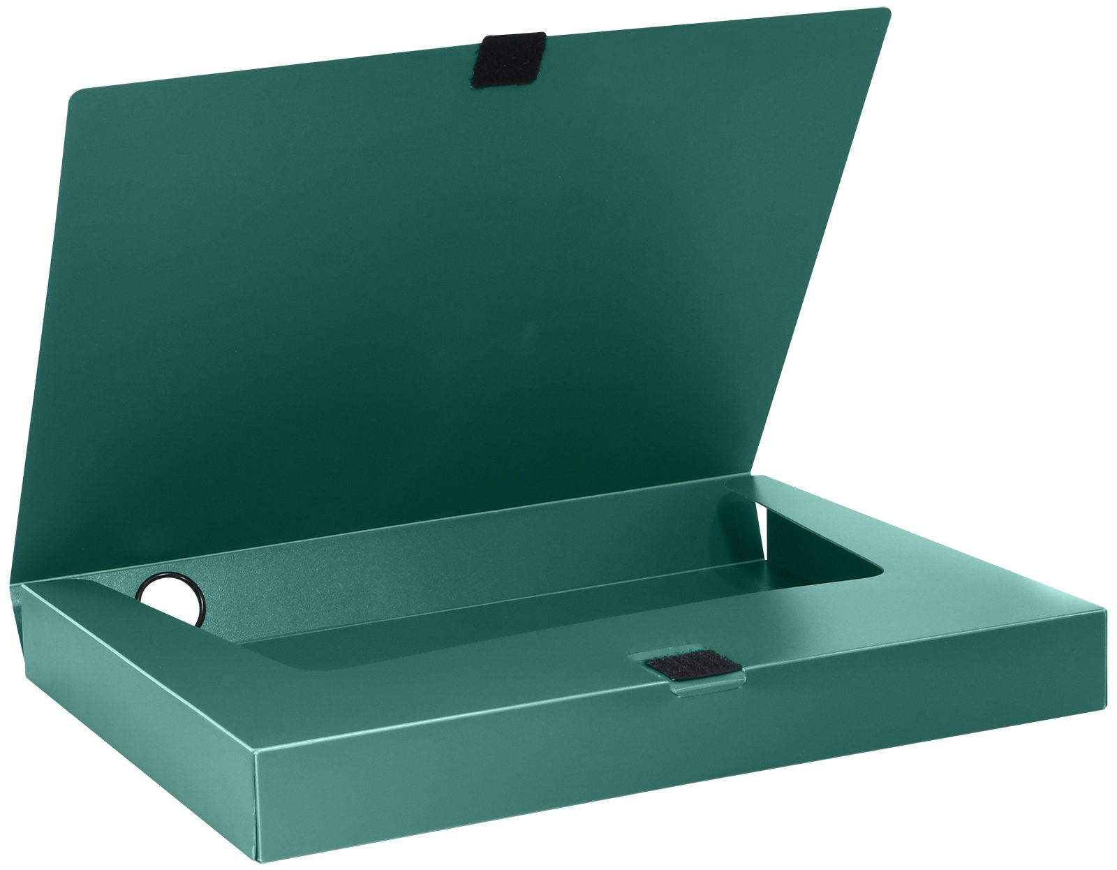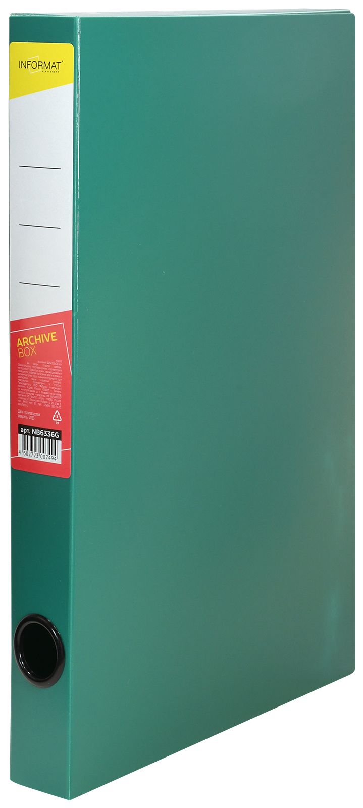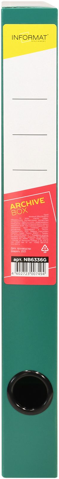 Короб формата А4 из твердого пластика. Толщина пластика – 0,8 мм (800 мкм). На корешке короба имеется цветной стикер для маркировки. Размер - 320х235х36 мм.
