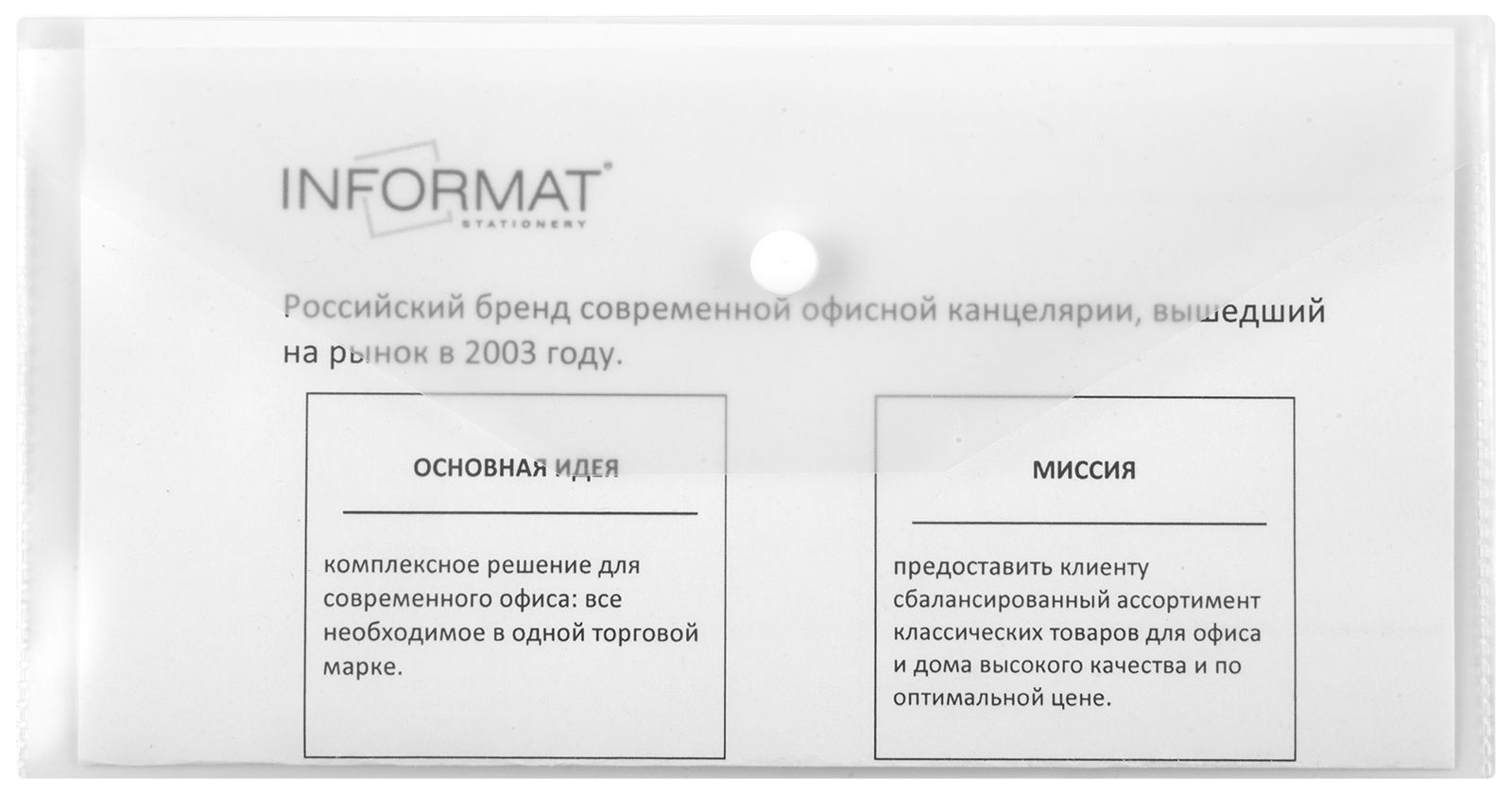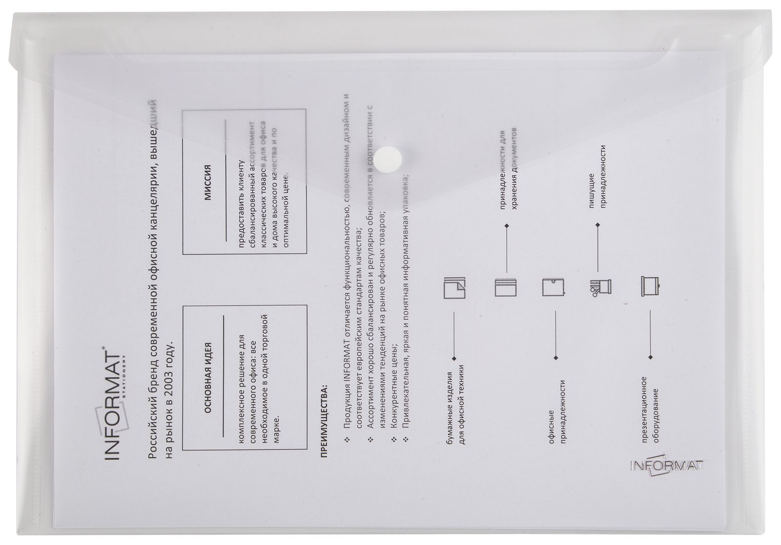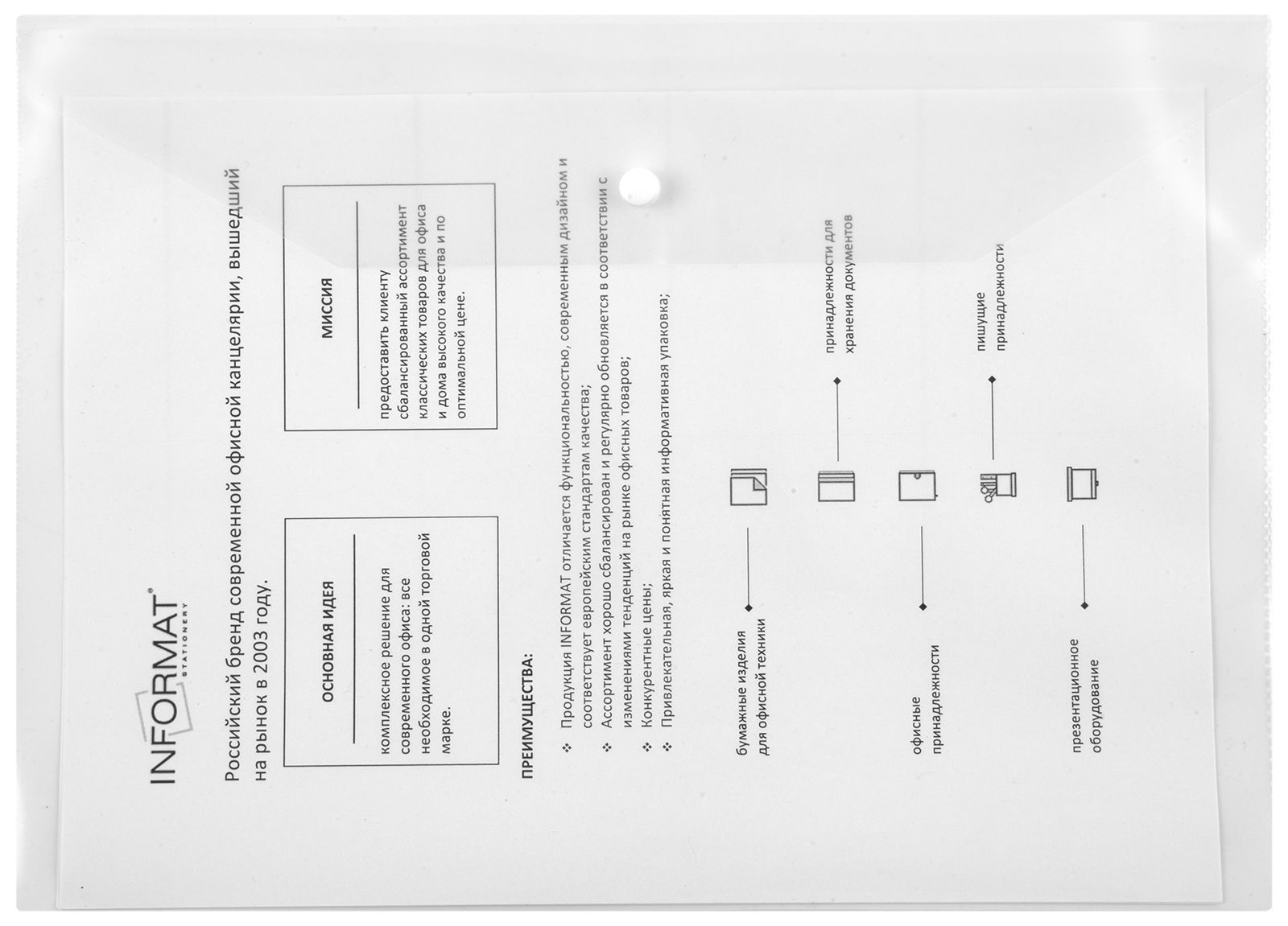 Формат: А5+ Цвет: прозрачный Ориентация: горизонтальный Ширина, мм: 280 Высота, мм: 210 Материал: пластик Мин. партия и варианты упаковок: 1 / 20 / 120 Пластиковый конверт INFORMAT А5+, на кнопке, прозрачный 180 мкм