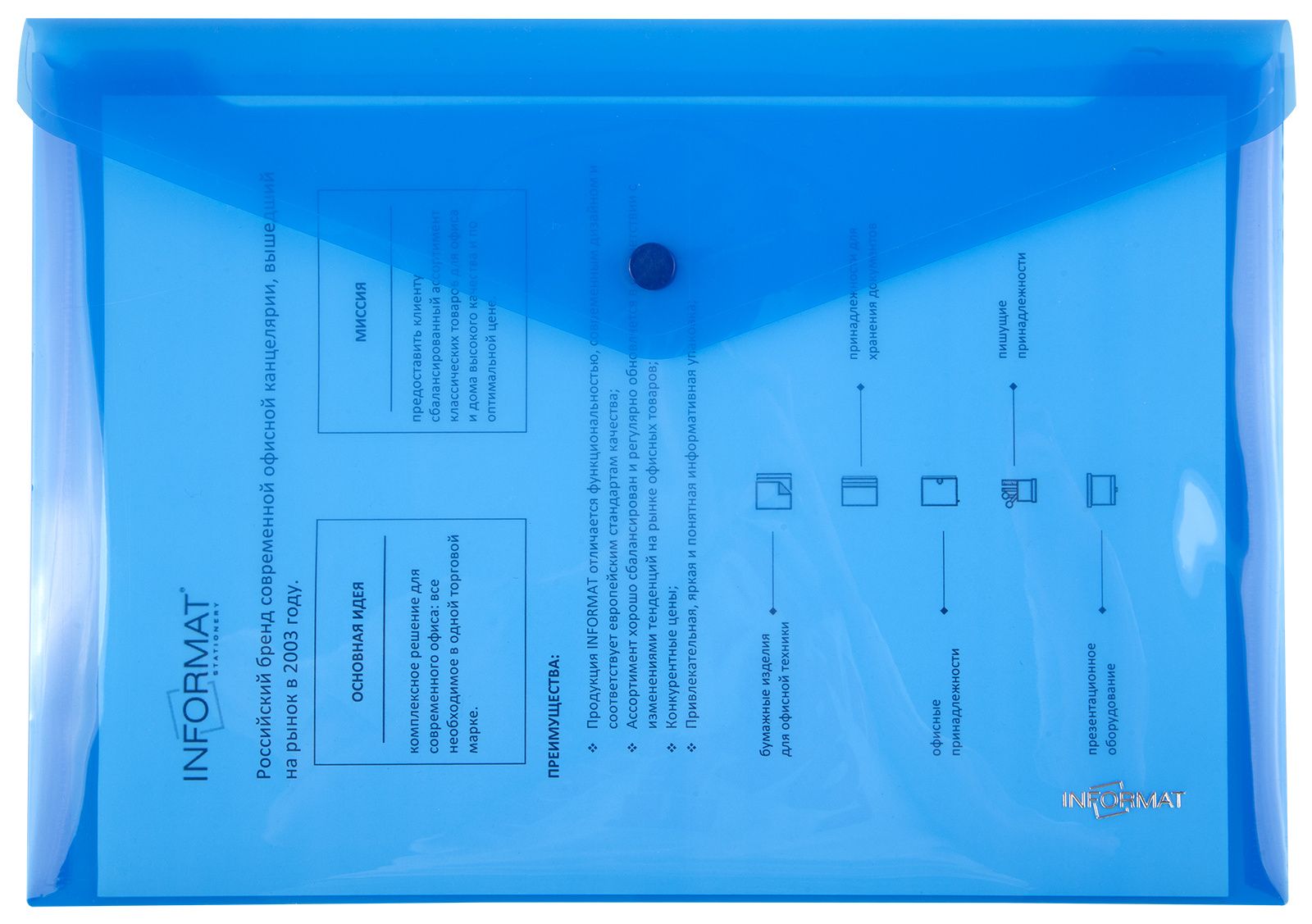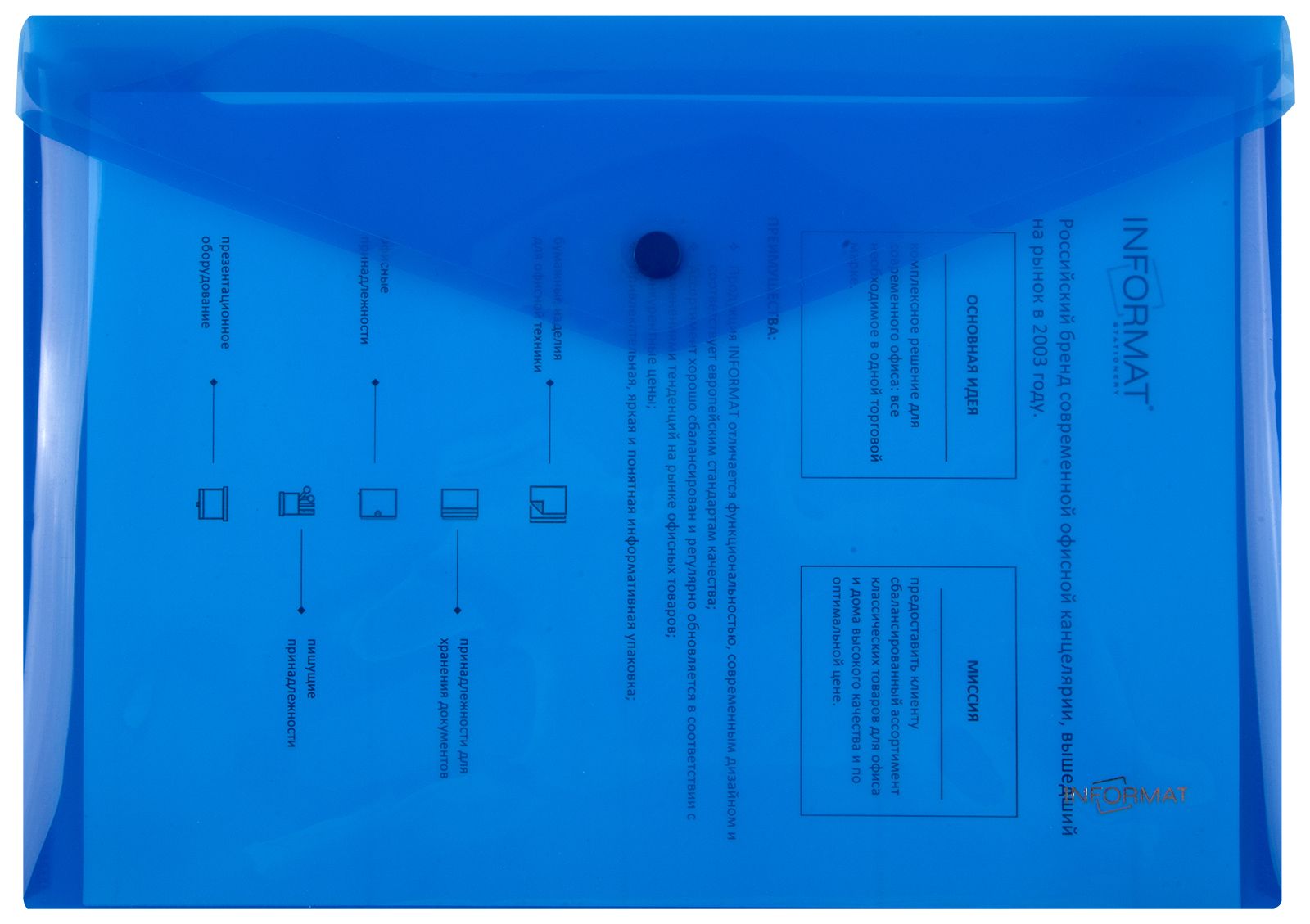 Формат: А4 Цвет: синий Ориентация: горизонтальный Ширина, мм: 330 Высота, мм: 240 Материал: пластик Мин. партия и варианты упаковок: 1 / 10 / 100 Пластиковый конверт INFORMAT А4, на кнопке, прозрачный 150 мкм, синий