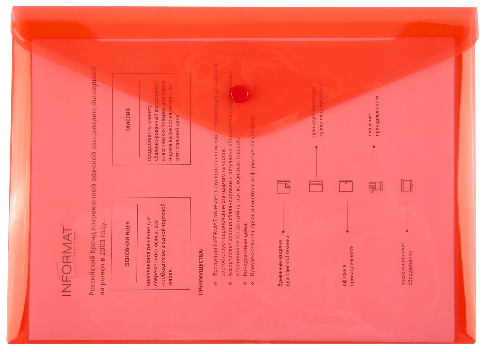 Формат: А4 Цвет: красный Ориентация: горизонтальный Ширина, мм: 330 Высота, мм: 240 Материал: пластик Мин. партия и варианты упаковок: 1 / 10 / 100 Пластиковый конверт INFORMAT А4, на кнопке, прозрачный 180 мкм, красный