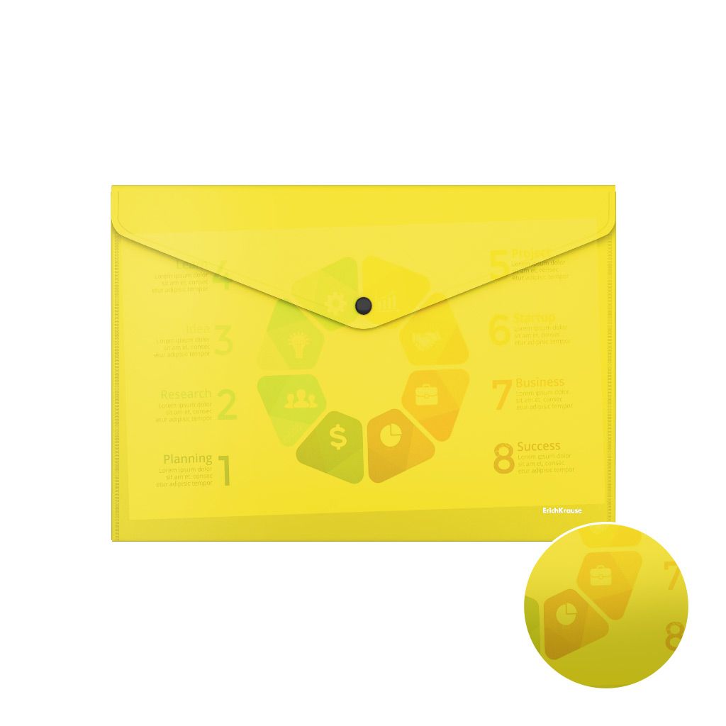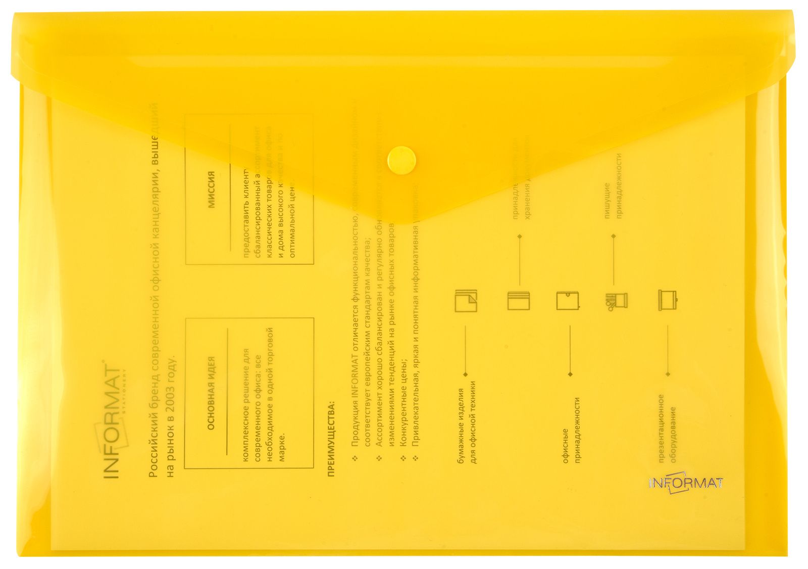Формат: А4 Цвет: желтый Ориентация: горизонтальный Ширина, мм: 330 Высота, мм: 240 Материал: пластик Мин. партия и варианты упаковок: 1 / 10 / 100 Пластиковый конверт INFORMAT А4, на кнопке, прозрачный 180 мкм, желтый