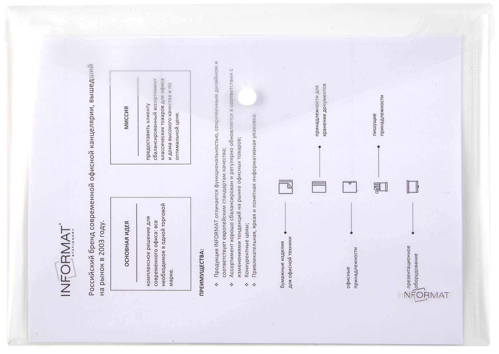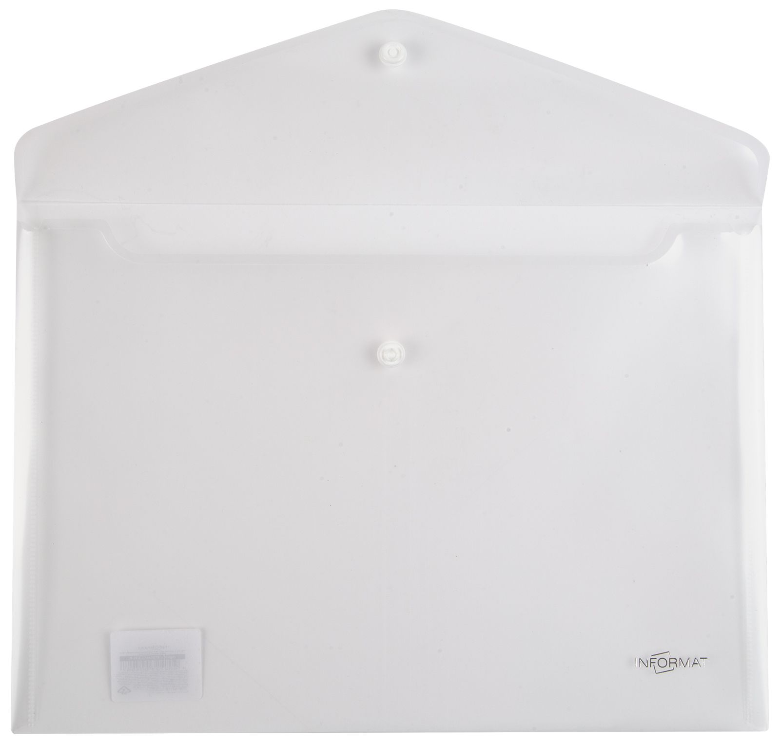 Формат: А5+ Цвет: прозрачный Ориентация: горизонтальный Ширина, мм: 280 Высота, мм: 210 Материал: пластик Мин. партия и варианты упаковок: 1 / 20 / 120 Пластиковый конверт INFORMAT А5+, на кнопке, прозрачный 180 мкм