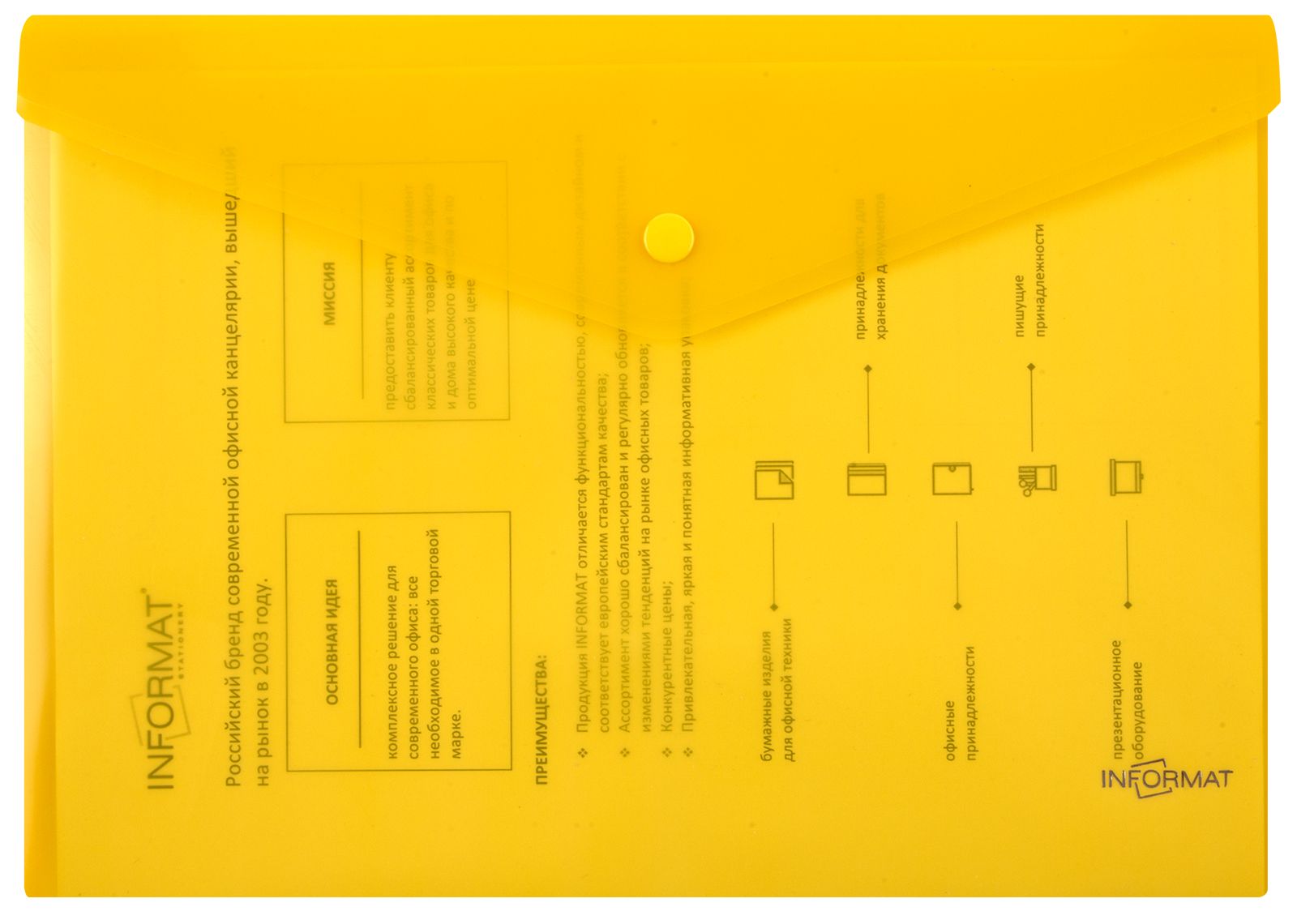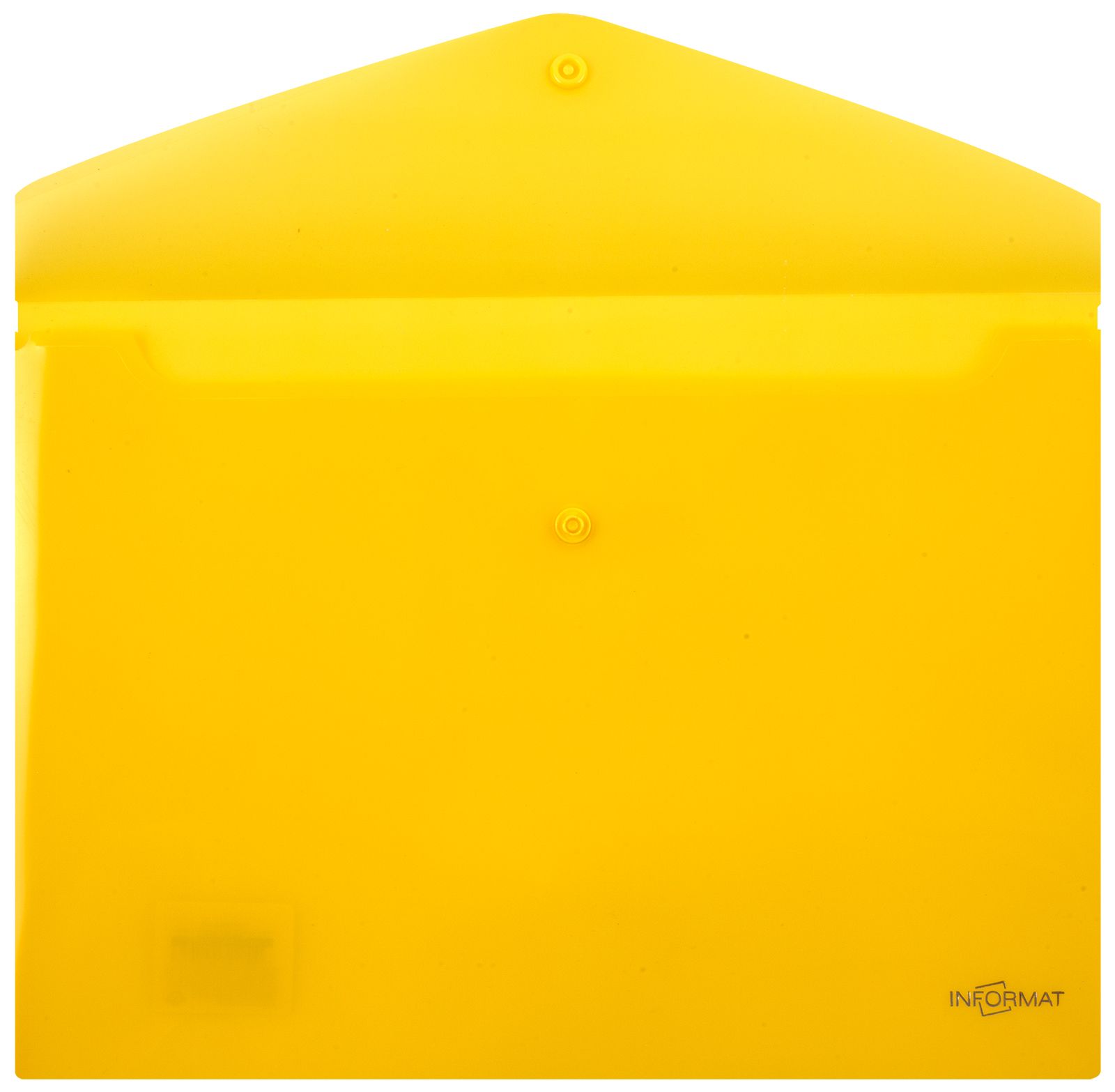 Формат: А4 Цвет: желтый Ориентация: горизонтальный Ширина, мм: 330 Высота, мм: 240 Материал: пластик Мин. партия и варианты упаковок: 1 / 10 / 100 Пластиковый конверт INFORMAT А4, на кнопке, прозрачный 180 мкм, желтый