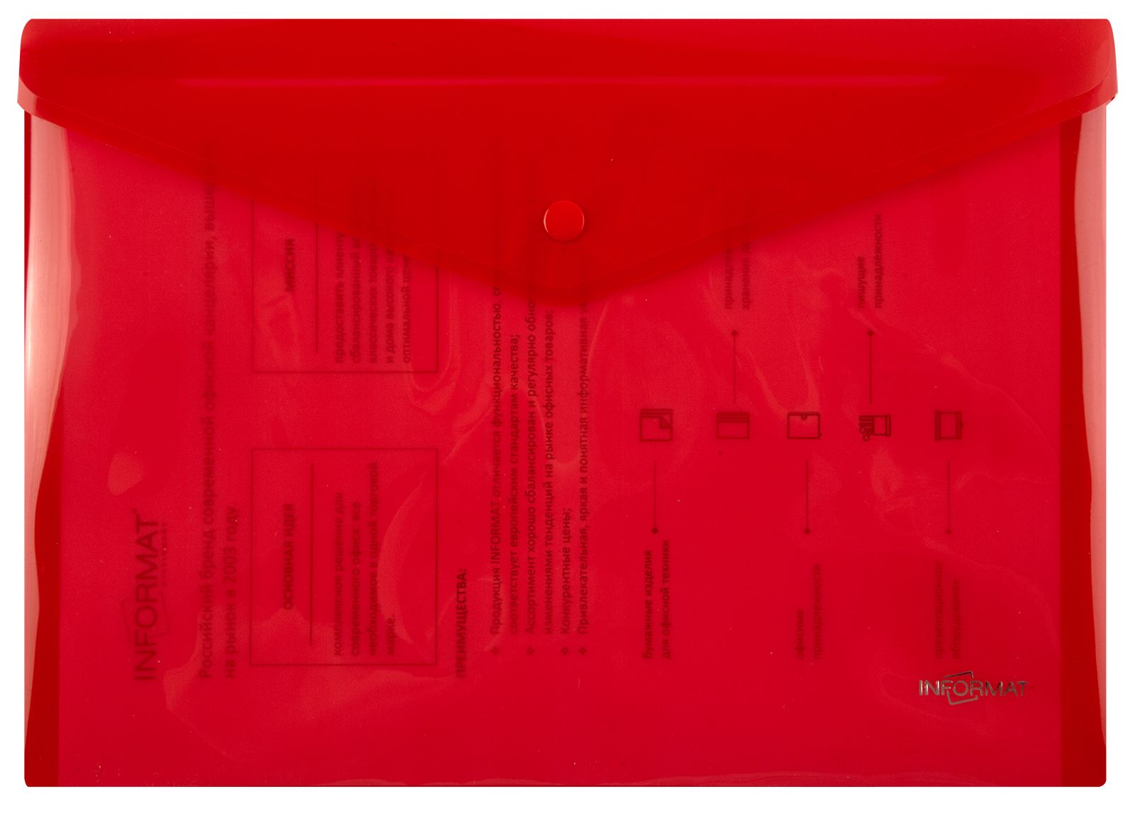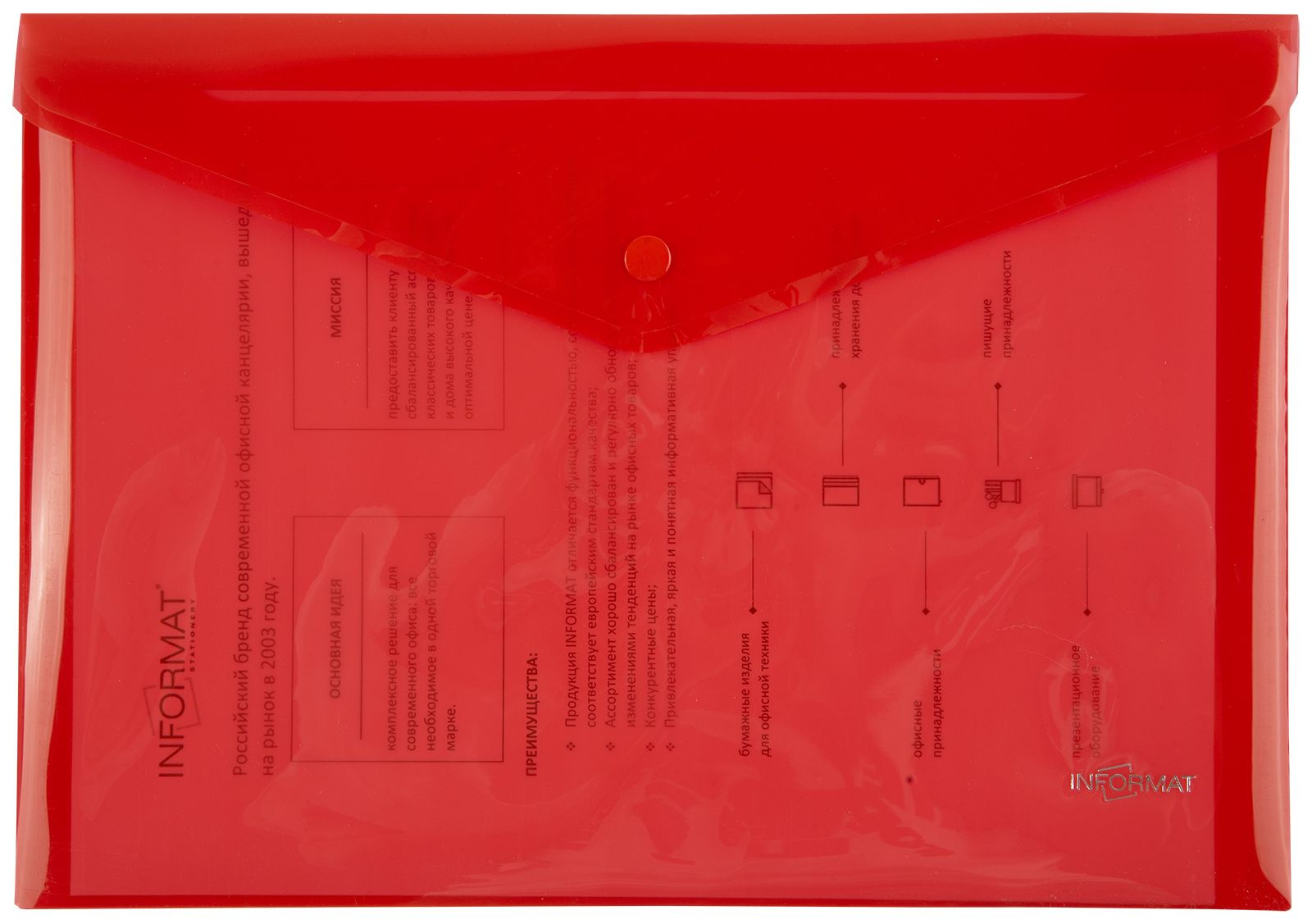 Формат: А4 Цвет: красный Ориентация: горизонтальный Ширина, мм: 330 Высота, мм: 240 Материал: пластик Мин. партия и варианты упаковок: 1 / 10 / 100 Пластиковый конверт INFORMAT А4, на кнопке, прозрачный 180 мкм, красный