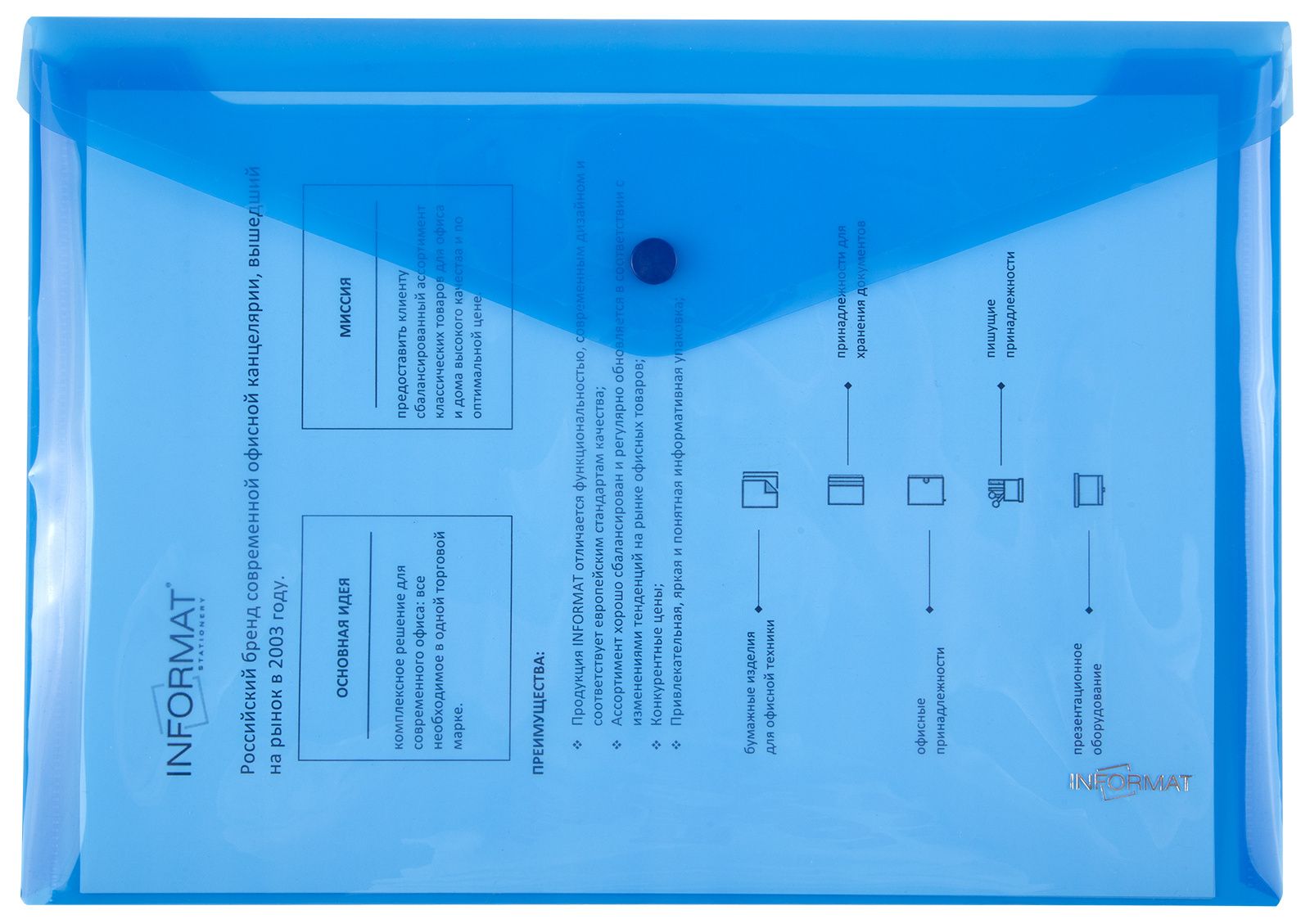 Формат: А4 Цвет: синий Ориентация: горизонтальный Ширина, мм: 330 Высота, мм: 240 Материал: пластик Мин. партия и варианты упаковок: 1 / 10 / 100 Пластиковый конверт INFORMAT А4, на кнопке, прозрачный 150 мкм, синий