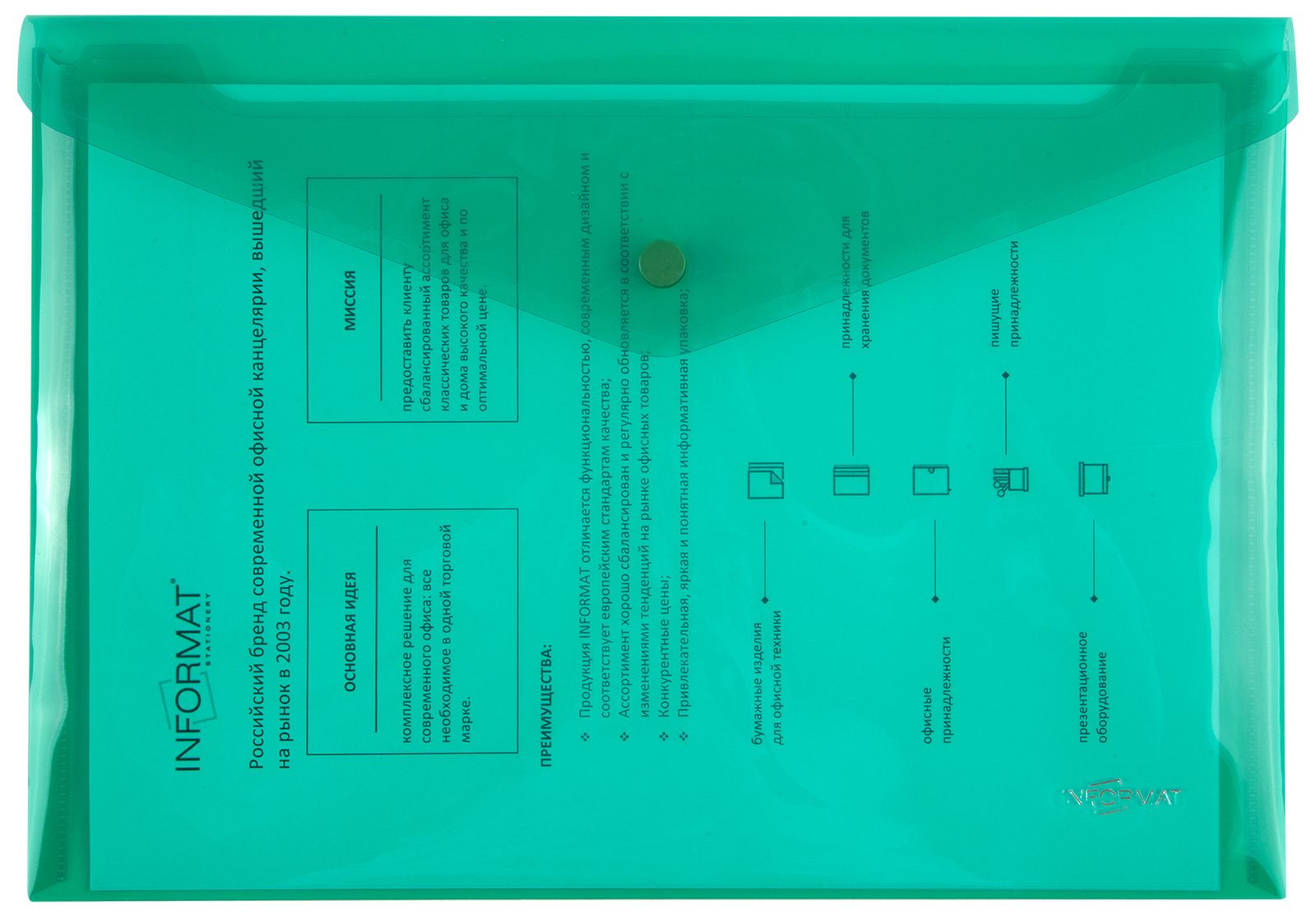 Формат: А4 Цвет: зеленый Ориентация: горизонтальный Ширина, мм: 330 Высота, мм: 240 Материал: пластик Мин. партия и варианты упаковок: 1 / 10 / 100 Пластиковый конверт INFORMAT А4, на кнопке, прозрачный 180 мкм, зеленый