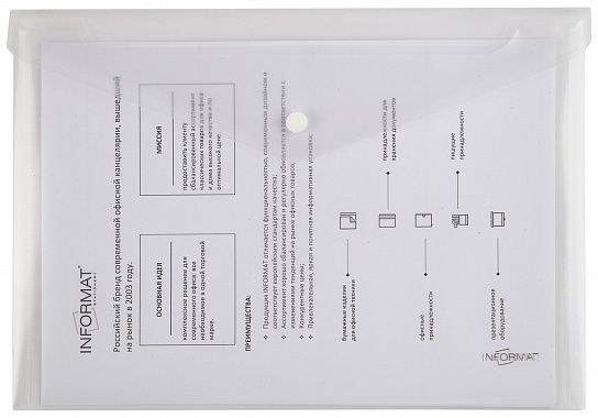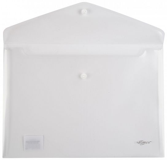 Папка-конверт на кнопке формата A4 из прозрачного пластика предназначена для хранения и транспортировки небольшого количества документов. Закрывается клапаном с помощью пластиковой кнопки.
