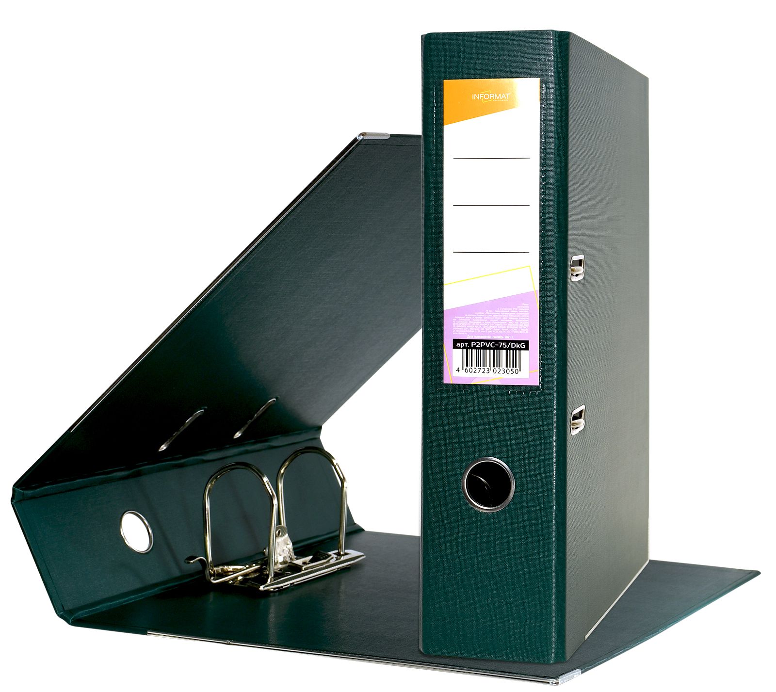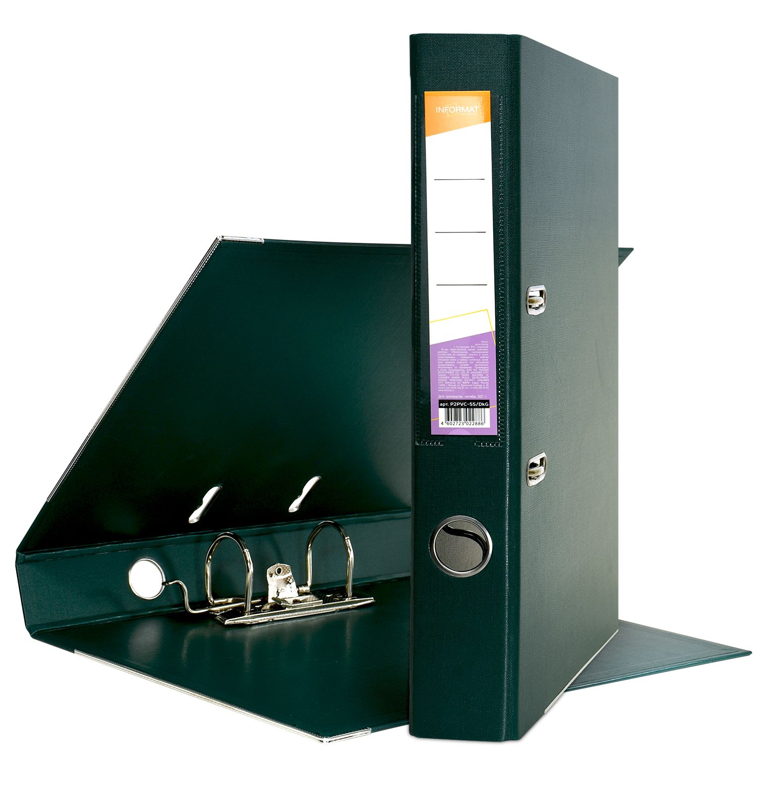 Формат: А4 Цвет: темно-зеленый Ширина, мм: 55 Материал: картон Вместимость листов: 350 Наличие металлической окантовки: Да Мин. партия и варианты упаковок: 1 / 10 / 50 Папка-регистратор INFORMAT 55 мм двухстороннее покрытие PVC, темно-зеленая